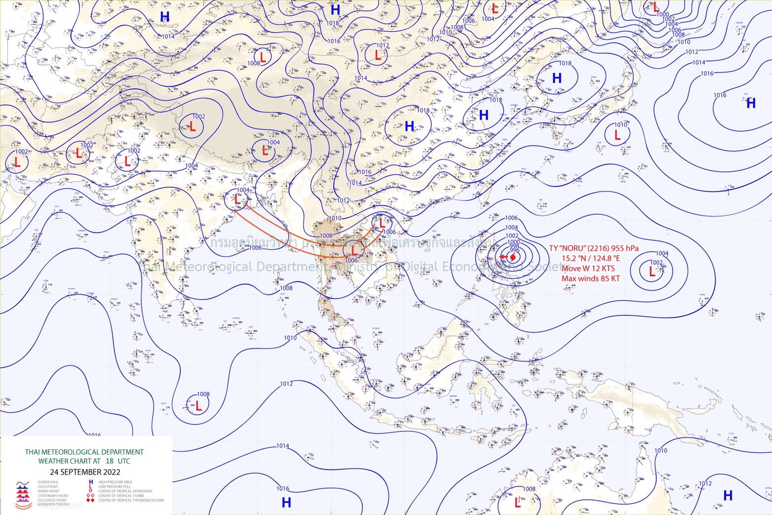 อนึ่ง พายุไต้ฝุ่น “โนรู” ด้านตะวันออกของฟิลิปปินส์ คาดว่าจะเคลื่อนตัวผ่านประเทศฟิลิปปินส์ลงสู่ทะเลจีนใต้ตอนกลางในช่วงวันที่ 25- 26 กันยายน และจะเคลื่อนขึ้นฝั่งประเทศเวียดนามตอนกลางในช่วงวันที่ 27-28 กันยายนนี้