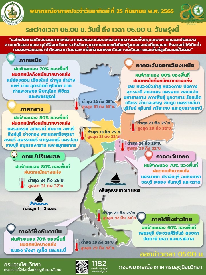 ลักษณะอากาศทั่วไป พยากรณ์อากาศ 24 ชั่วโมงข้างหน้า ร่องมรสุมกำลังแรงพาดผ่านภาคเหนือตอนล่างและภาคกลางตอนบน เข้าสู่หย่อมความกดอากาศต่ำบริเวณภาคตะวันออกเฉียงเหนือ ประกอบกับมรสุมตะวันตกเฉียงใต้ที่พัดปกคลุมทะเลอันดามัน ภาคใต้ และอ่าวไทย มีกำลังปานกลาง ลักษณะเช่นนี้ทำให้ประเทศไทยมีฝนตกหนักถึงหนักมากบางแห่งในภาคเหนือ ภาคตะวันออกเฉียงเหนือ ภาคกลางรวมทั้งกรุงเทพมหานครและปริมณฑล ภาคตะวันออก และภาคใต้ฝั่งตะวันตก ขอให้ประชาชนในบริเวณดังกล่าวระวังอันตรายจากฝนตกหนักและฝนที่ตกสะสมซึ่งอาจทำให้เกิดน้ำท่วมฉับพลันและน้ำป่าไหลหลาก โดยเฉพาะพื้นที่ลาดเชิงเขาใกล้ทางน้ำไหลผ่านและพื้นที่ลุ่มไว้ด้วย