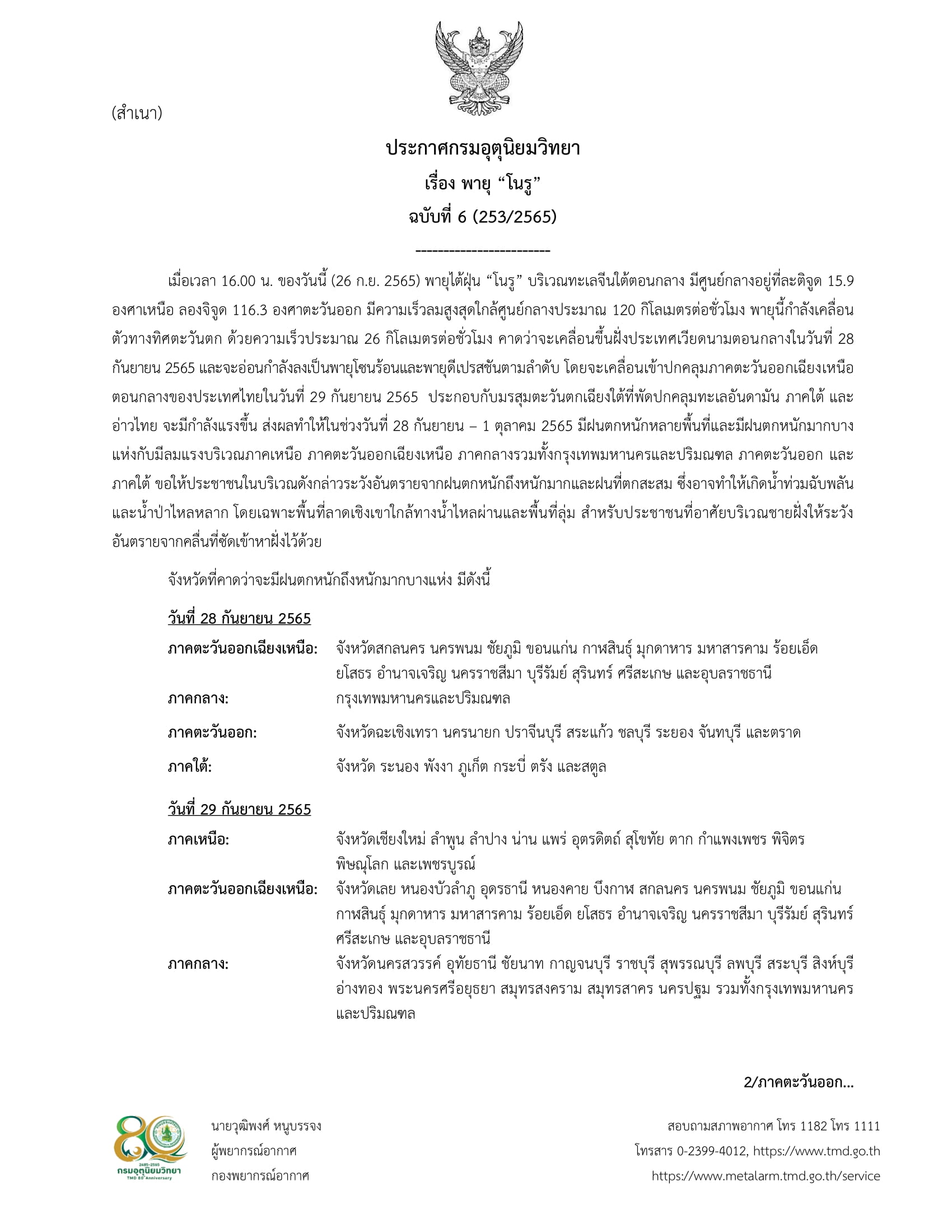 ประกาศกรมอุตุนิยมวิทยา เรื่อง พายุ “โนรู” ฉบับที่ 6 (253/2565)