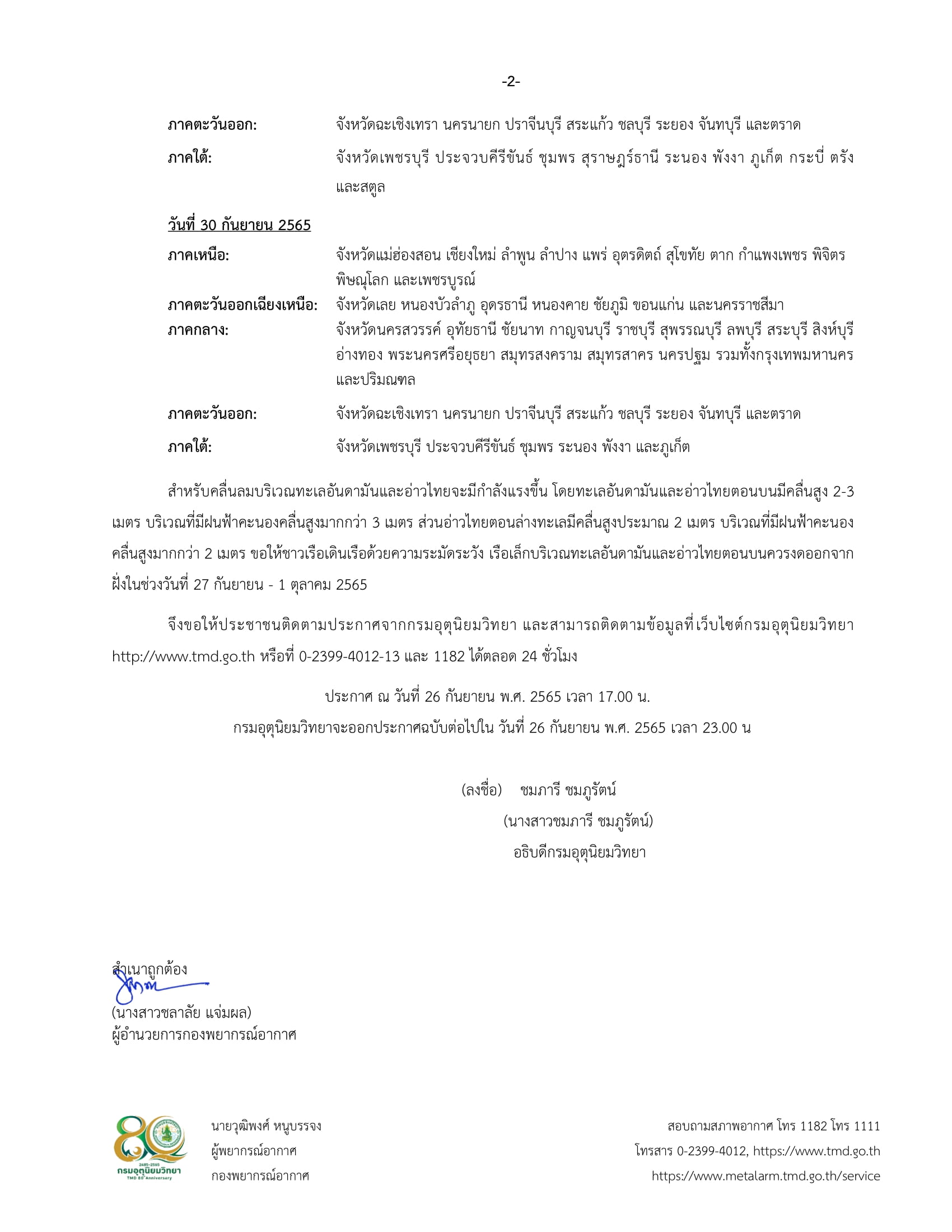 โดยจะเคลื่อนเข้าปกคลุมภาคตะวันออกเฉียงเหนือ ตอนกลางของประเทศไทยในวันที่ 29 กันยายน 2565 ประกอบกับมรสุมตะวันตกเฉียงใต้ที่พัดปกคลุมทะเลอันดามัน ภาคใต้ และ อ่าวไทย จะมีกำลังแรงขึ้น ส่งผลทำให้ในช่วงวันที่ 28 กันยายน – 1 ตุลาคม 2565 มีฝนตกหนักหลายพื้นที่และมีฝนตกหนักมากบางแห่งกับมีลมแรงบริเวณภาคเหนือ ภาคตะวันออกเฉียงเหนือ ภาคกลางรวมทั้งกรุงเทพมหานครและปริมณฑล ภาคตะวันออก และภาคใต้ ขอให้ประชาชนในบริเวณดังกล่าวระวังอันตรายจากฝนตกหนักถึงหนักมากและฝนที่ตกสะสม ซึ่งอาจทำให้เกิดน้ำท่วมฉับพลันและน้ำป่าไหลหลาก โดยเฉพาะพื้นที่ลาดเชิงเขาใกล้ทางน้ำไหลผ่านและพื้นที่ลุ่ม สำหรับประชาชนที่อาศัยบริเวณชายฝั่งให้ระวังอันตรายจากคลื่นที่ซัดเข้าหาฝั่งไว้ด้วย