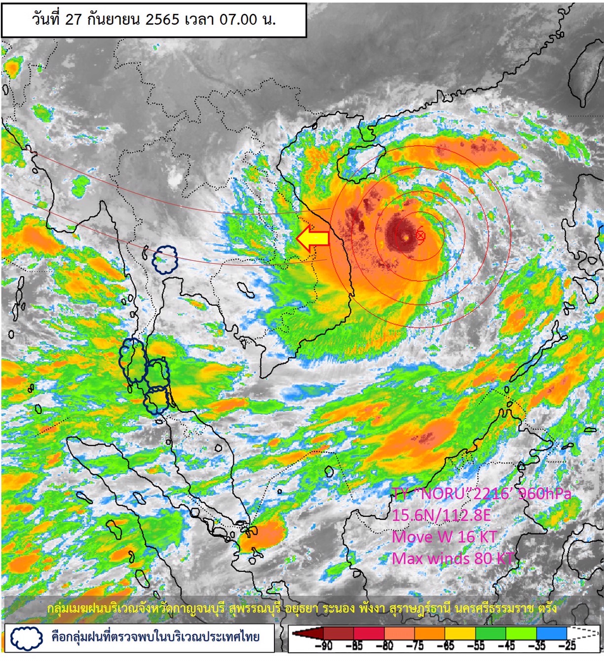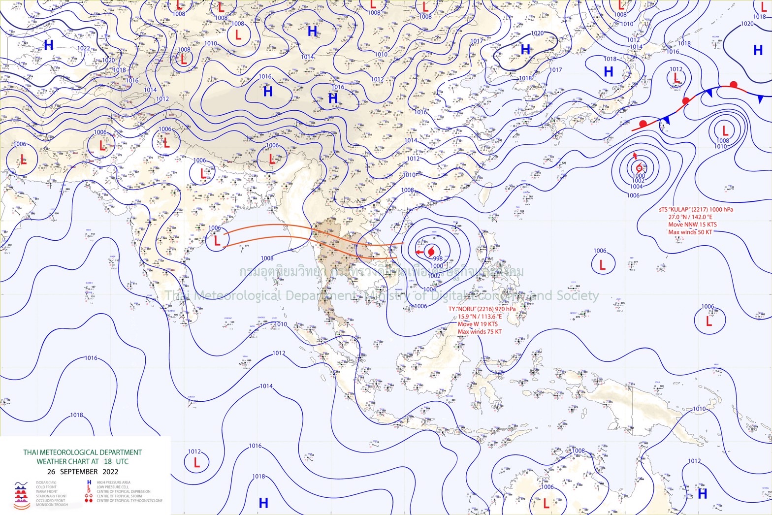 อนึ่ง พายุไต้ฝุ่น “โนรู” บริเวณทะเลจีนใต้ตอนกลาง คาดว่าจะเคลื่อนขึ้นฝั่งประเทศเวียดนามตอนกลาง ในวันที่ 28 กันยายน 2565 และจะอ่อนกำลังลงเป็นพายุโซนร้อน และพายุดีเปรสชันตามลำดับ จากนั้นจะเคลื่อนเข้าปกคลุมภาคตะวันออกเฉียงเหนือตอนกลาง
