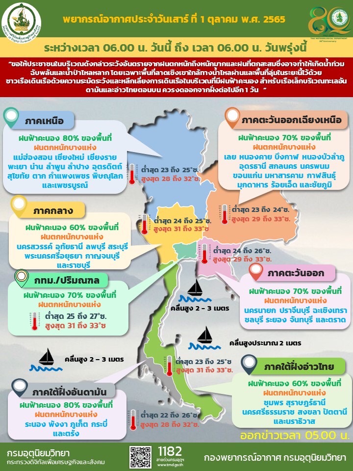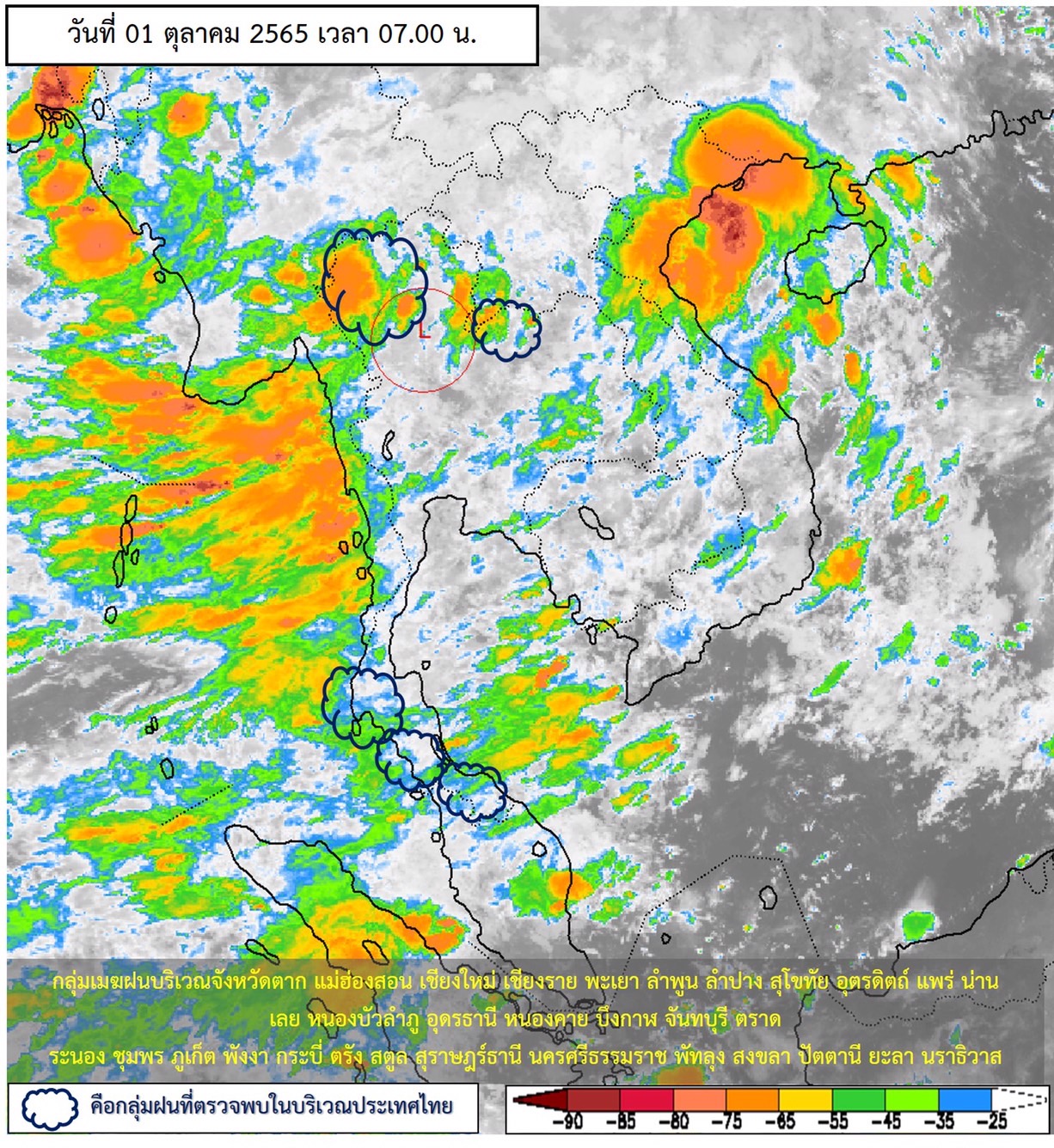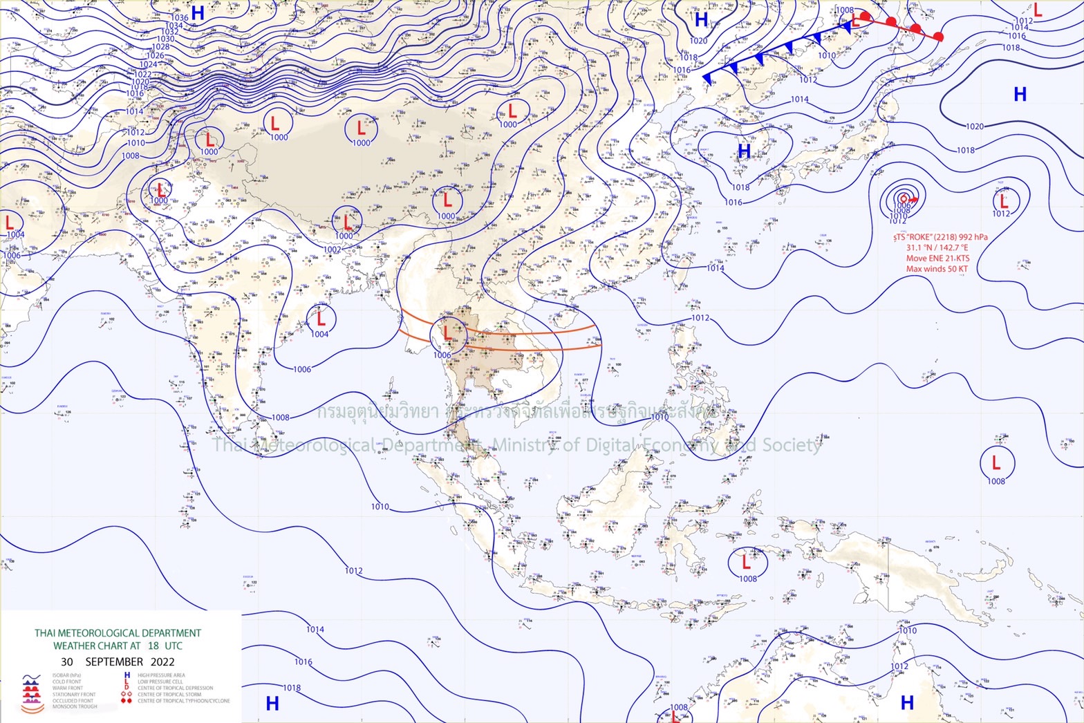 ลักษณะอากาศทั่วไป พยากรณ์อากาศ 24 ชั่วโมงข้างหน้า ร่องมรสุมพาดผ่านภาคเหนือและภาคตะวันออกเฉียงเหนือตอนบน ประกอบกับมีหย่อมความกดอากาศต่ำปกคลุมภาคเหนือด้านตะวันตก ในขณะที่มรสุมตะวันตกเฉียงใต้กำลังค่อนข้างแรงยังคงพัดปกคลุมทะเลอันดามัน ภาคใต้ และอ่าวไทย ลักษณะเช่นนี้ทำให้ประเทศไทยมีฝนตกต่อเนื่องและมีฝนตกหนักถึงหนักมากบางแห่งในภาคเหนือ ภาคตะวันออกเฉียงเหนือ ภาคกลาง รวมทั้งกรุงเทพมหานครและปริมณฑล ภาคตะวันออก และภาคใต้ ขอให้ประชาชนในบริเวณดังกล่าวระวังอันตรายจากฝนตกหนักถึงหนักมากและฝนที่ตกสะสมซึ่งอาจทำให้เกิดน้ำท่วมฉับพลันและน้ำป่าไหลหลาก โดยเฉพาะพื้นที่ลาดเชิงเขาใกล้ทางน้ำไหลผ่านและพื้นที่ลุ่มในระยะนี้ไว้ด้วย