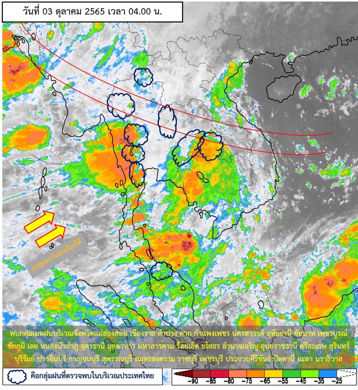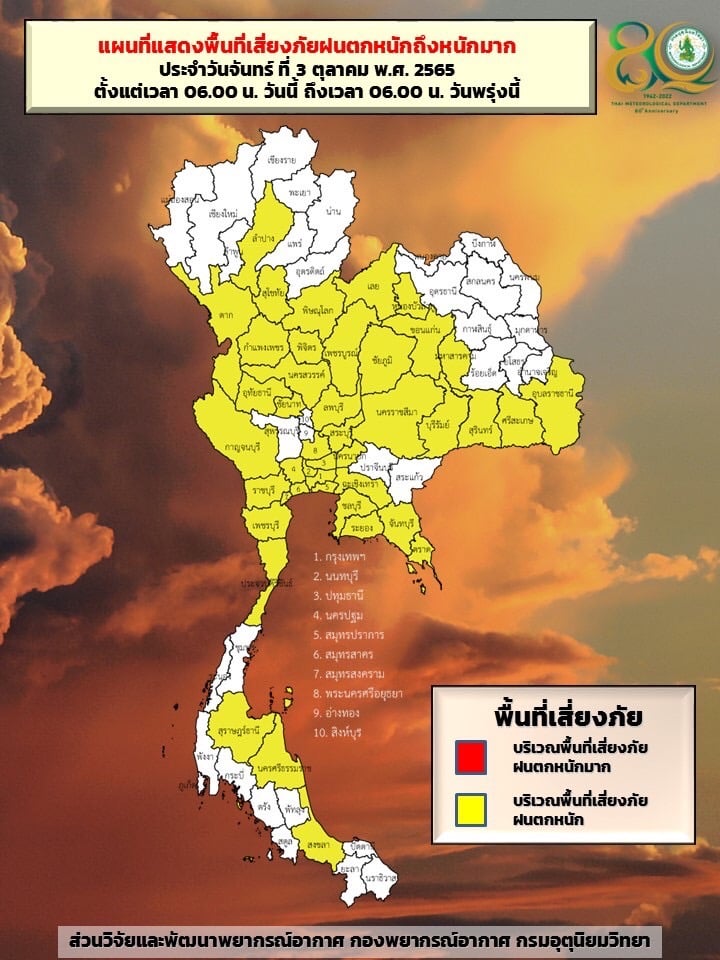 ลักษณะอากาศทั่วไป พยากรณ์อากาศ 24 ชั่วโมงข้างหน้า บริเวณความกดอากาศสูงหรือมวลอากาศเย็นจากประเทศจีนปกคลุมภาคเหนือตอนบน ภาคตะวันออกเฉียงเหนือตอนบน และทะเลจีนใต้ ส่งผลทำให้ร่องมรสุมเลื่อนลงมาพาดผ่านภาคเหนือตอนล่าง ภาคกลาง ภาคตะวันออก และภาคตะวันออกเฉียงเหนือตอนล่าง ประกอบกับมรสุมตะวันตกเฉียงใต้กำลังปานกลางพัดปกคลุมทะเลอันดามัน ภาคใต้ และอ่าวไทย ในขณะที่มีลมตะวันออกเฉียงใต้พัดปกคลุมภาคตะวันออกเฉียงเหนือตอนล่าง ลักษณะเช่นนี้ทำให้ประเทศไทยยังคงมีฝนตกต่อเนื่อง และมีฝนตกหนักบางแห่งในภาคเหนือ ภาคตะวันออกเฉียงเหนือ ภาคกลาง รวมทั้งกรุงเทพมหานครและปริมณฑล ภาคตะวันออก และภาคใต้ฝั่งตะวันออก ขอให้ประชาชนในบริเวณดังกล่าวระวังอันตรายจากฝนตกหนักและฝนที่ตกสะสมซึ่งอาจทำให้เกิดน้ำท่วมฉับพลันและน้ำป่าไหลหลาก โดยเฉพาะพื้นที่ลาดเชิงเขาใกล้ทางน้ำไหลผ่านและพื้นที่ลุ่มในระยะนี้ไว้ด้วย