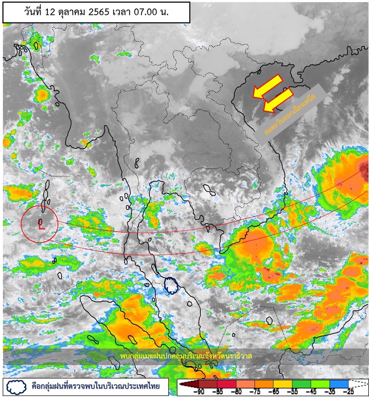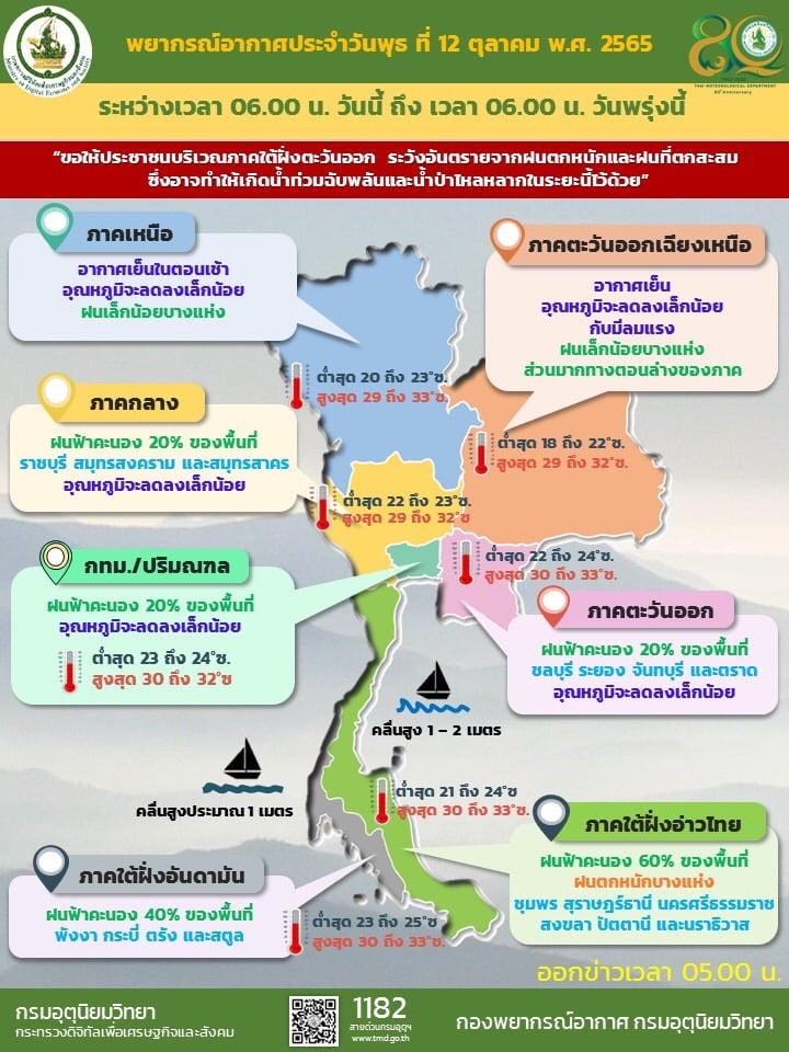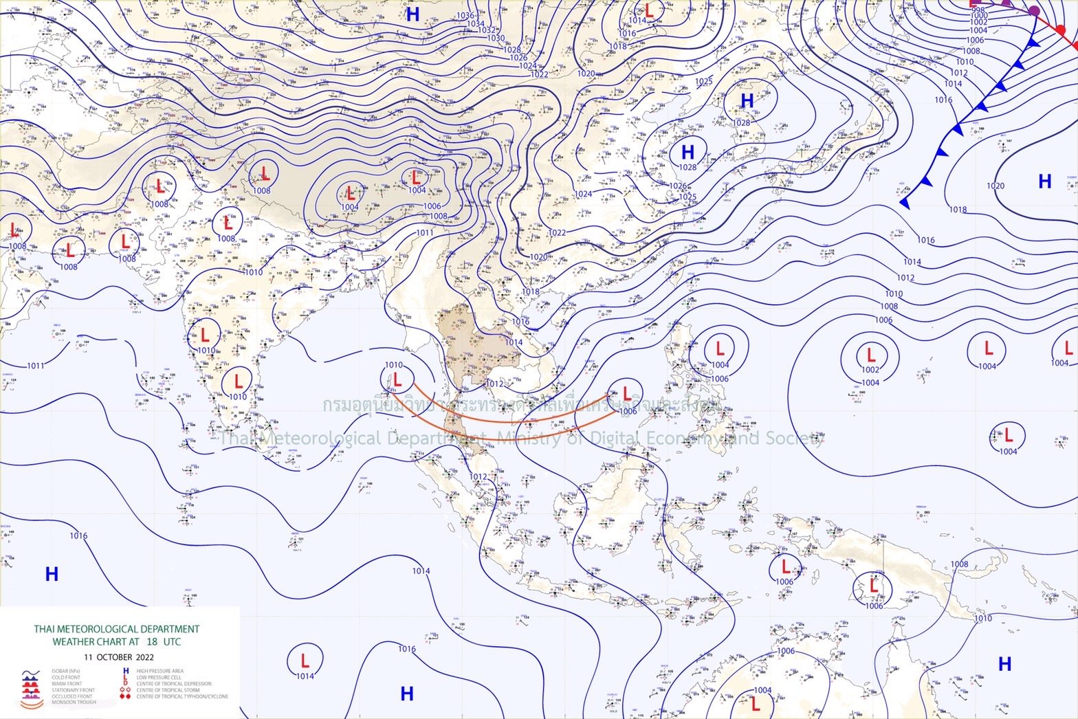 ลักษณะอากาศทั่วไป พยากรณ์อากาศ 24 ชั่วโมงข้างหน้า บริเวณความกดอากาศสูงหรือมวลอากาศเย็นกำลังปานกลาง จากประเทศจีนปกคลุมประเทศไทยตอนบน ทำให้บริเวณดังกล่าวมีอุณหภูมิลดลงเล็กน้อย กับมีลมแรงในภาคตะวันออกเฉียงเหนือ ในขณะที่ร่องมรสุมพาดผ่านบริเวณภาคใต้ตอนกลาง ทำให้ภาคใต้ฝั่งตะวันออกมีฝนตกหนักบางแห่ง ขอให้ประชาชนบริเวณดังกล่าว ระวังอันตรายจากฝนตกหนักและฝนที่ตกสะสม ซึ่งอาจทำให้เกิดน้ำท่วมฉับพลัน และน้ำป่าไหลหลากในระยะนี้ไว้ด้วย ส่วนคลื่นลมบริเวณอ่าวไทยมีคลื่นสูง 1-2 เมตร และบริเวณที่มีฝนฟ้าคะนองคลื่นสูงประมาณ 2 เมตร