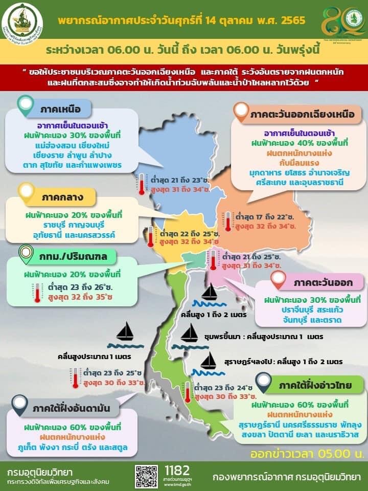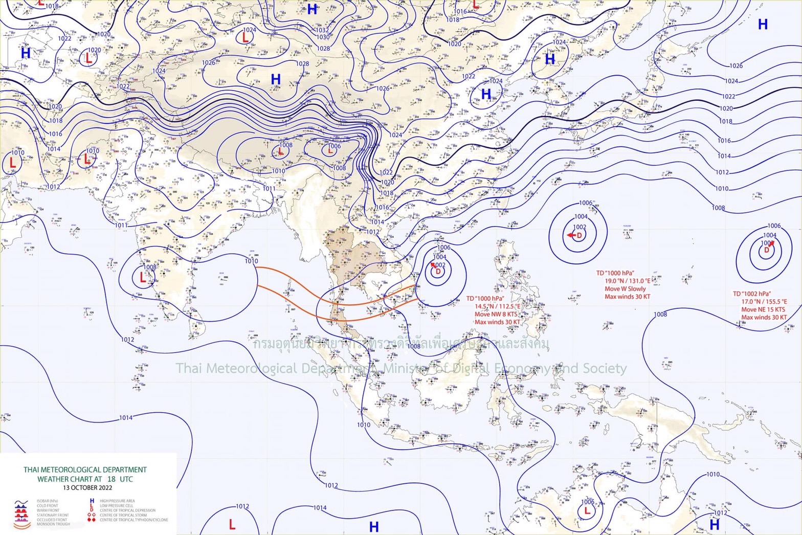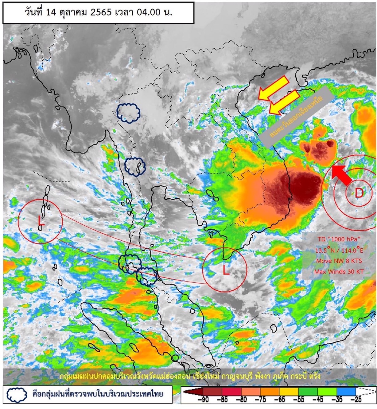อนึ่ง พายุดีเปรสชันบริเวณทะเลจีนใต้ตอนกลาง มีแนวโน้มจะมีกำลังแรงขึ้นเป็นพายุโซนร้อนในระยะต่อไป คาดว่าจะเคลื่อนขึ้นฝั่งประเทศเวียดนามตอนกลาง ในวันที่ 14-15 ต.ค. 65 และจะอ่อนกำลังลงอย่างรวดเร็วเป็นหย่อมความกดอากาศต่ำกำลังแรง ส่งผลให้ในช่วงวันที่ 14-15 ต.ค. 65 บริเวณภาคตะวันออกเฉียงเหนือ ภาคตะวันออก ภาคกลาง รวมทั้งกรุงเทพมหานครและปริมณฑล จะมีฝนเพิ่มขึ้น โดยมีฝนตกหนักบางแห่งในภาคตะวันออกเฉียงเหนือ