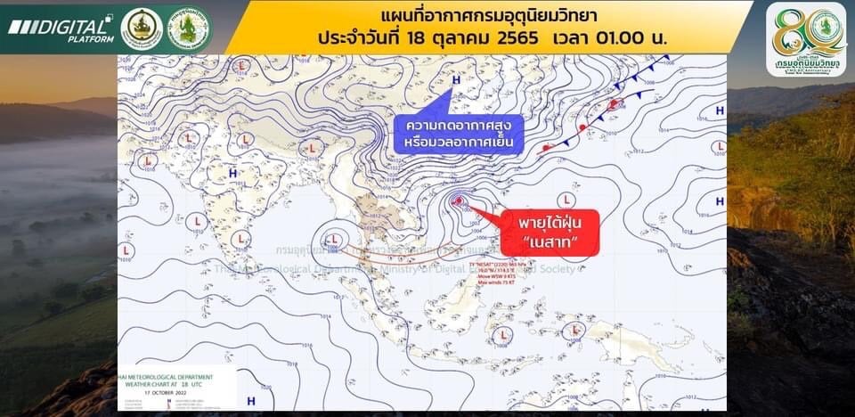 อนึ่ง พายุไต้ฝุ่น “เนสาท” บริเวณทะเลจีนใต้ตอนบน มีศูนย์กลางอยู่ห่างประมาณ 350 กิโลเมตร ทางตะวันออกของเกาะไหหลำ ประเทศจีน คาดว่าพายุนี้จะเคลื่อนผ่านตอนใต้ของเกาะไหหลำ และเคลื่อนขึ้นฝั่งบริเวณประเทศเวียดนามตอนบน ในช่วงวันที่ 19-21 ต.ค. 65 ในขณะที่บริเวณความกดอากาศสูงหรือมวลอากาศเย็นกำลังค่อนข้างแรงจากประเทศจีน ยังคงปกคลุมประเทศไทยตอนบนและทะเลจีนใต้ ลักษณะเช่นนี้จะทำให้พายุอ่อนกำลังลงตามลำดับอย่างรวดเร็ว แต่ยังคงส่งผลให้บริเวณประเทศไทยตอนบน มีฝนบางแห่งเกิดขึ้นได้