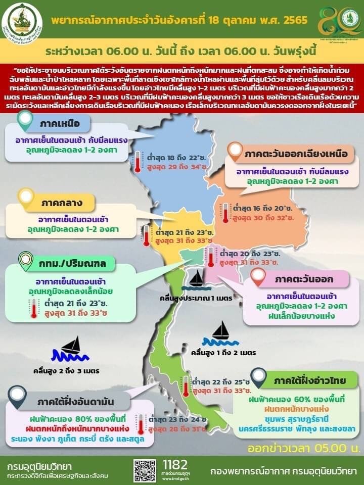 พยากรณ์อากาศ ประจำวันอังคารที่ 18 ตุลาคม 2565