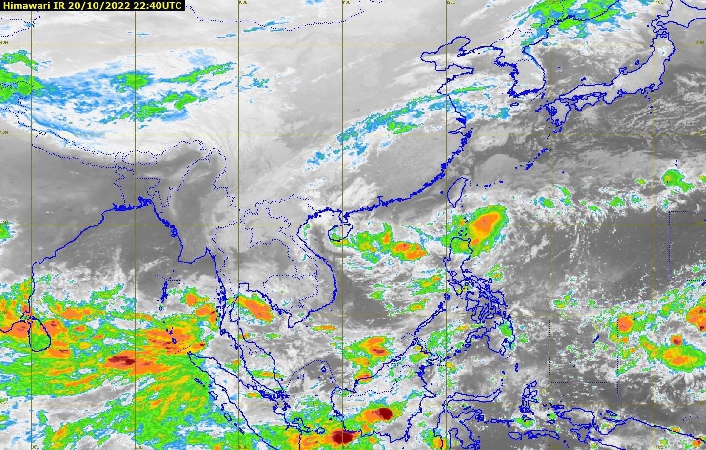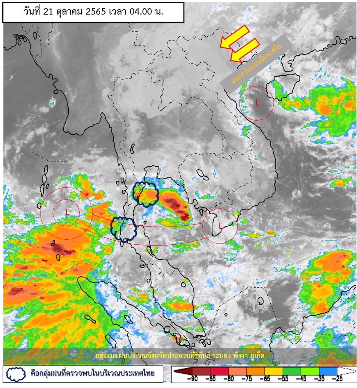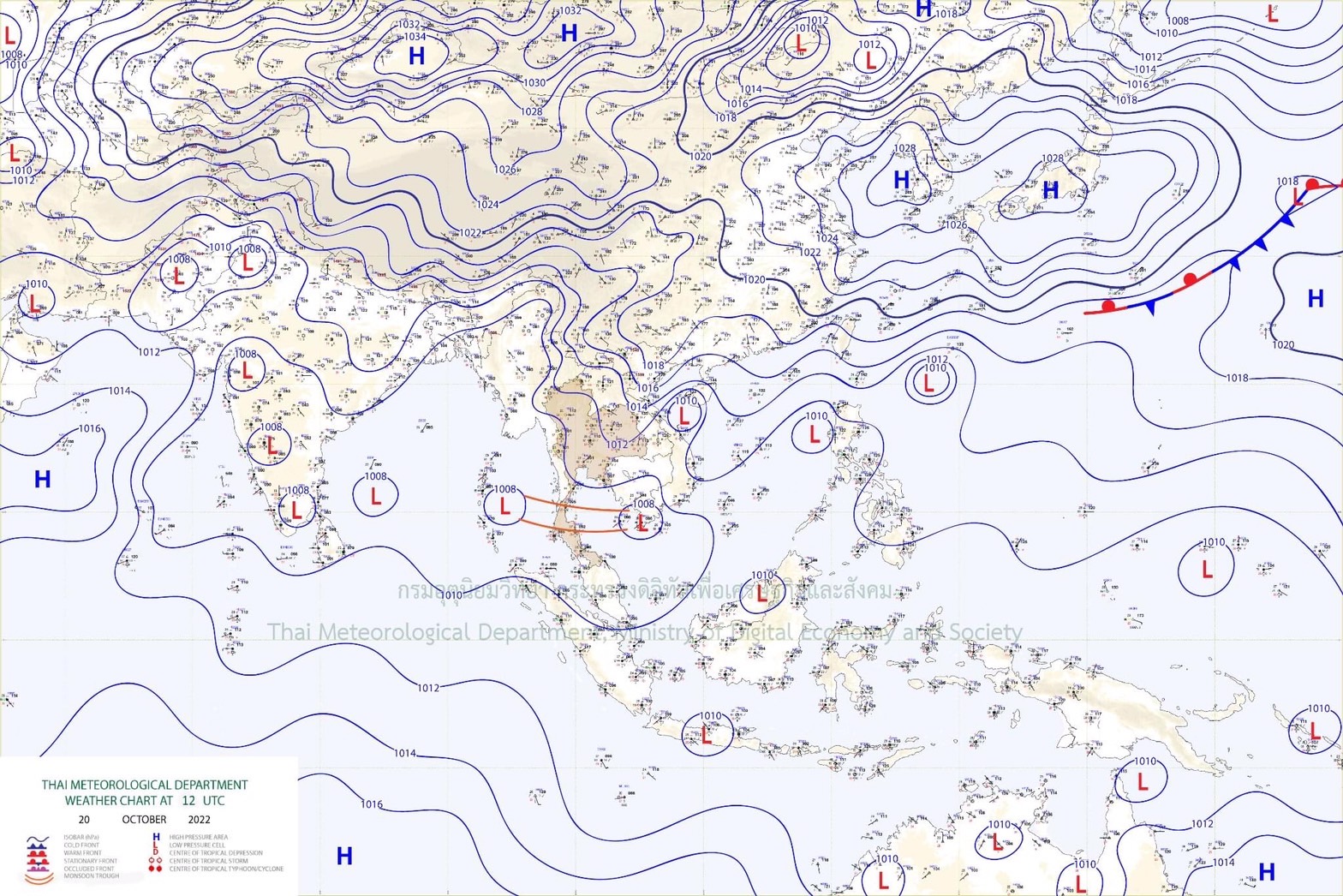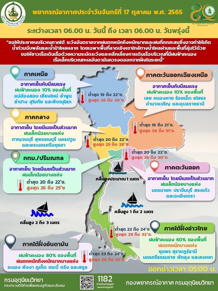 ลักษณะอากาศทั่วไป พยากรณ์อากาศ 24 ชั่วโมง ร่องมรสุมพาดผ่านภาคใต้ตอนกลาง ประกอบกับมีหย่อมความกดอากาศต่ำกำลังแรง ปกคลุมทะเลอันดามันตอนกลาง ในขณะที่ลมตะวันตกเฉียงใต้ ที่พัดปกคลุมทะเลอันดามันตอนบนมีกำลังแรง ทำให้ภาคใต้มีฝนตกต่อเนื่อง และมีฝนตกหนักถึงหนักมากบางแห่ง ขอให้ประชาชนบริเวณภาคใต้ ระวังอันตรายจากฝนตกหนักถึงหนักมากและฝนที่ตกสะสม ซึ่งอาจทำให้เกิดน้ำท่วมฉับพลันและน้ำป่าไหลหลาก โดยเฉพาะพื้นที่ลาดเชิงเขาใกล้ทางน้ำไหลผ่านและพื้นที่ลุ่มไว้ด้วย ส่วนคลื่นลมบริเวณทะเลอันดามันตอนบนคลื่นสูง 2-3 เมตร บริเวณที่มีฝนฟ้าคะนองคลื่นสูงมากกว่า 3 เมตร ส่วนทะเลอันดามันตอนล่างและอ่าวไทยมีคลื่นสูง 1-2 เมตร บริเวณที่มีฝนฟ้าคะนองคลื่นสูงมากกว่า 2 เมตร ขอให้ชาวเรือเดินเรือด้วยความระมัดระวัง และหลีกเลี่ยงการเดินเรือบริเวณที่มีฝนฟ้าคะนอง เรือเล็กบริเวณทะเลอันดามันตอนบน ควรงดออกจากฝั่งจนถึงวันที่ 22 ต.ค. 65