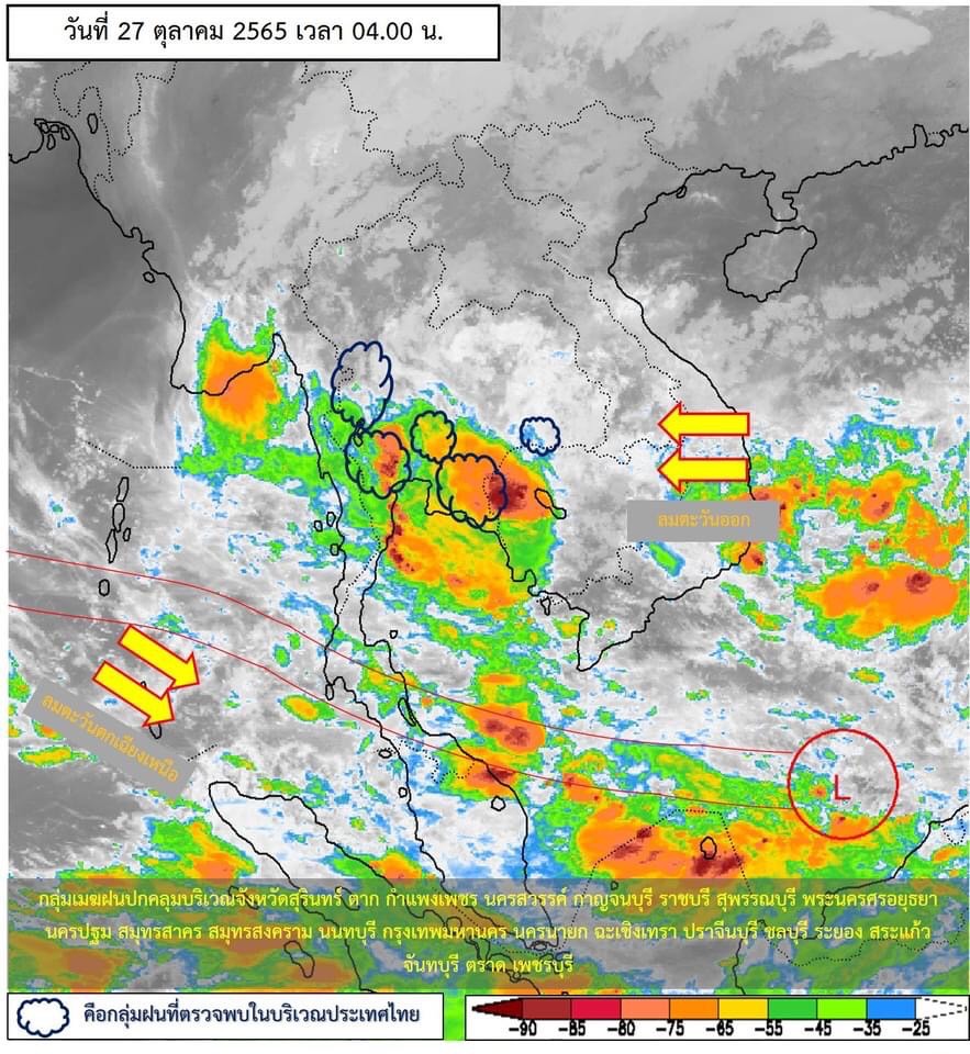 ลักษณะอากาศทั่วไป พยากรณ์อากาศ 24 ชั่วโมง บริเวณความกดอากาศสูงหรือมวลอากาศเย็นกำลังอ่อนปกคลุมภาคตะวันออกเฉียงเหนือตอนบน และทะเลจีนใต้ ทำให้บริเวณดังกล่าวยังคงมีอากาศเย็นในตอนเช้า ในขณะที่ลมตะวันออกพัดปกคลุมภาคเหนือ ภาคตะวันออกเฉียงเหนือตอนล่าง ภาคกลาง รวมทั้งกรุงเทพมหานครและปริมณฑล และภาคตะวันออก ทำให้ประเทศไทยตอนบนมีฝนฟ้าคะนองเกิดขึ้น ขอให้ประชาชนบริเวณประเทศไทยตอนบน ดูแลรักษาสุขภาพเนื่องจากสภาพอากาศที่เปลี่ยนแปลงในระยะนี้ไว้ด้วย