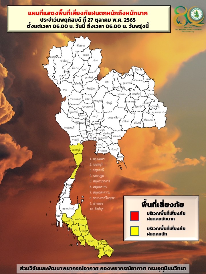 กทม.และปริมณฑล มีฝนฟ้าคะนองร้อยละ 60 ของพื้นที่ อุณหภูมิต่ำสุด 24-26 องศาเซลเซียส อุณหภูมิสูงสุด 32-34 องศาเซลเซียส ลมตะวันออกเฉียงเหนือ ความเร็ว 10-20 กม./ชม.