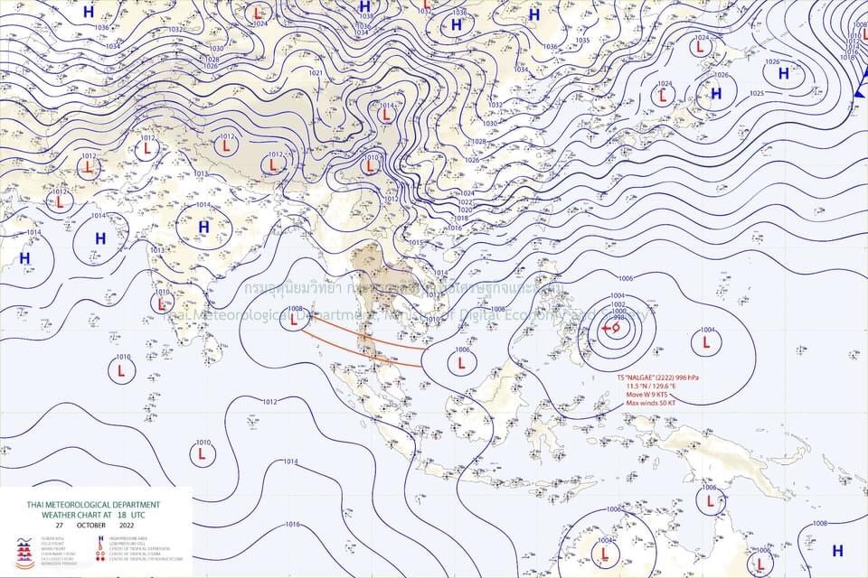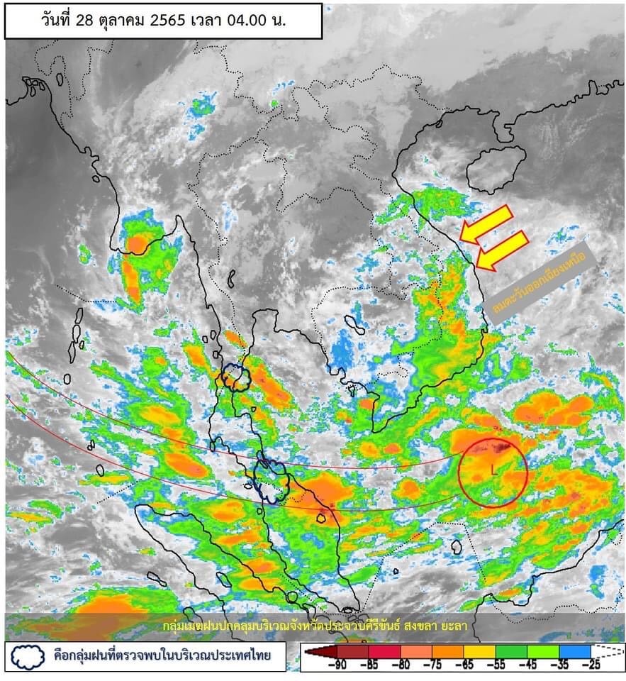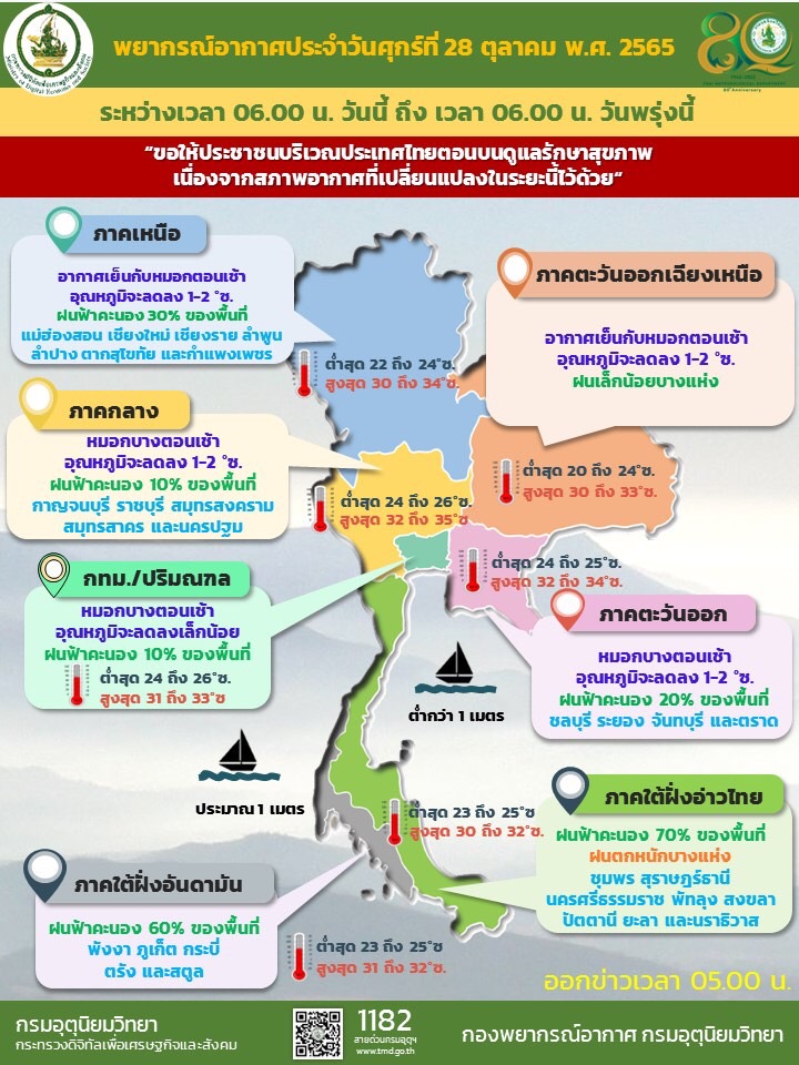 อนึ่ง บริเวณความกดอากาศสูงกำลังปานกลางระลอกใหม่จากประเทศจีน ได้แผ่ปกคลุมประเทศจีนตอนใต้แล้ว คาดว่าจะแผ่ลงมาปกคลุมประเทศไทยตอนบน ในวันพรุ่งนี้ (29 ต.ค. 65) ลักษณะเช่นนี้ทำให้ภาคเหนือ ภาคตะวันออกเฉียงเหนือ ภาคกลาง และภาคตะวันออก จะมีอุณหภูมิลดลง 1-2 องศาเซลเซียส กับมีลมแรง