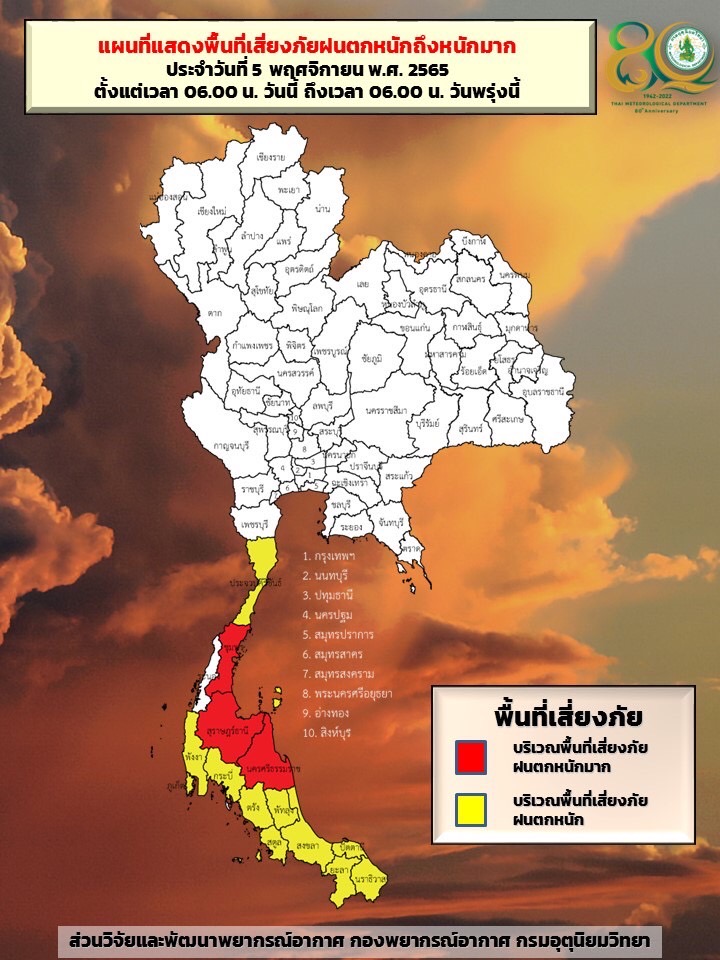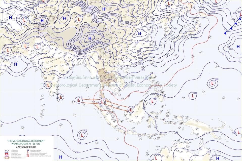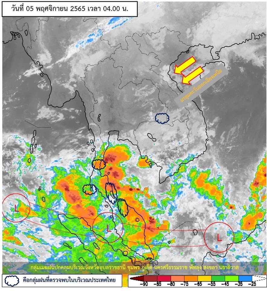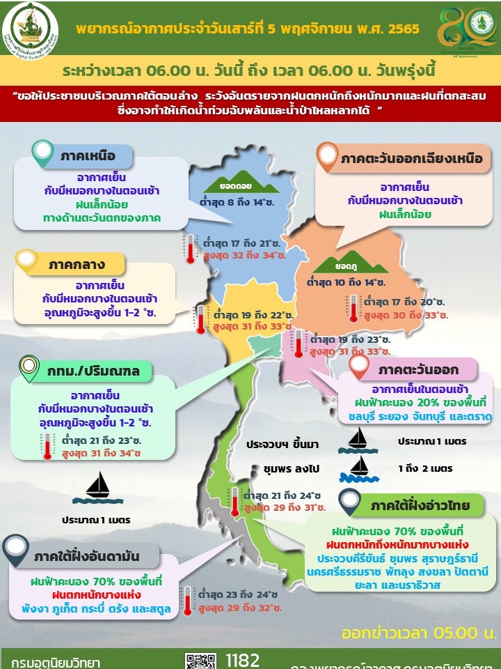 ลักษณะอากาศทั่วไป พยากรณ์อากาศ 24 ชั่วโมง ร่องมรสุมพาดผ่านภาคใต้ตอนล่าง เข้าสู่หย่อมความกดอากาศต่ำ ที่ปกคลุมบริเวณทะเลอันดามันตอนล่าง และช่องแคบมะละกา ประกอบกับมรสุมตะวันออกเฉียงเหนือและลมตะวันออก พัดปกคลุมภาคใต้ อ่าวไทย และทะเลอันดามัน ทำให้ภาคใต้ยังคงมีฝนตกต่อเนื่องและมีฝนตกหนักถึงหนักมากบางแห่ง ขอให้ประชาชนในบริเวณดังกล่าว ระวังอันตรายจากฝนตกหนักถึงหนักมากและฝนที่ตกสะสม ซึ่งอาจทำให้เกิดน้ำท่วมฉับพลันและน้ำป่าไหลหลากในระยะนี้