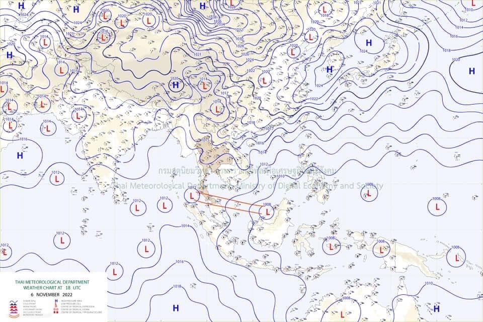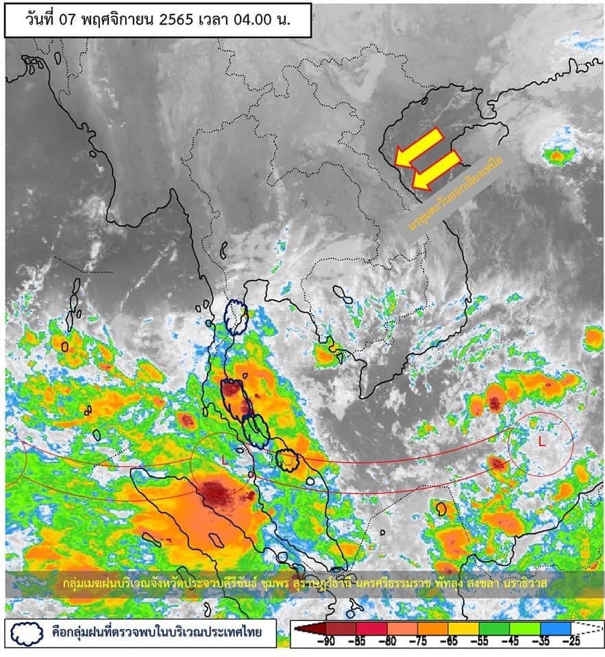 ลักษณะอากาศทั่วไป พยากรณ์อากาศ 24 ชั่วโมง ร่องมรสุมพาดผ่านภาคใต้ตอนล่างเข้าสู่หย่อมความกดอากาศต่ำที่ปกคลุมบริเวณทะเลอันดามันตอนล่าง ประกอบกับมรสุมตะวันออกเฉียงเหนือและลมตะวันออกที่พัดปกคลุมภาคใต้ อ่าวไทย และทะเลอันดามันเริ่มมีกำลังอ่อนลง แต่ยังคงทำให้ภาคใต้มีฝนตกหนักบางแห่ง ขอให้ประชาชนในบริเวณดังกล่าวระวังอันตรายจากฝนตกหนักและฝนที่ตกสะสมซึ่งอาจทำให้เกิดน้ำท่วมฉับพลันและน้ำป่าไหลหลากในระยะนี้