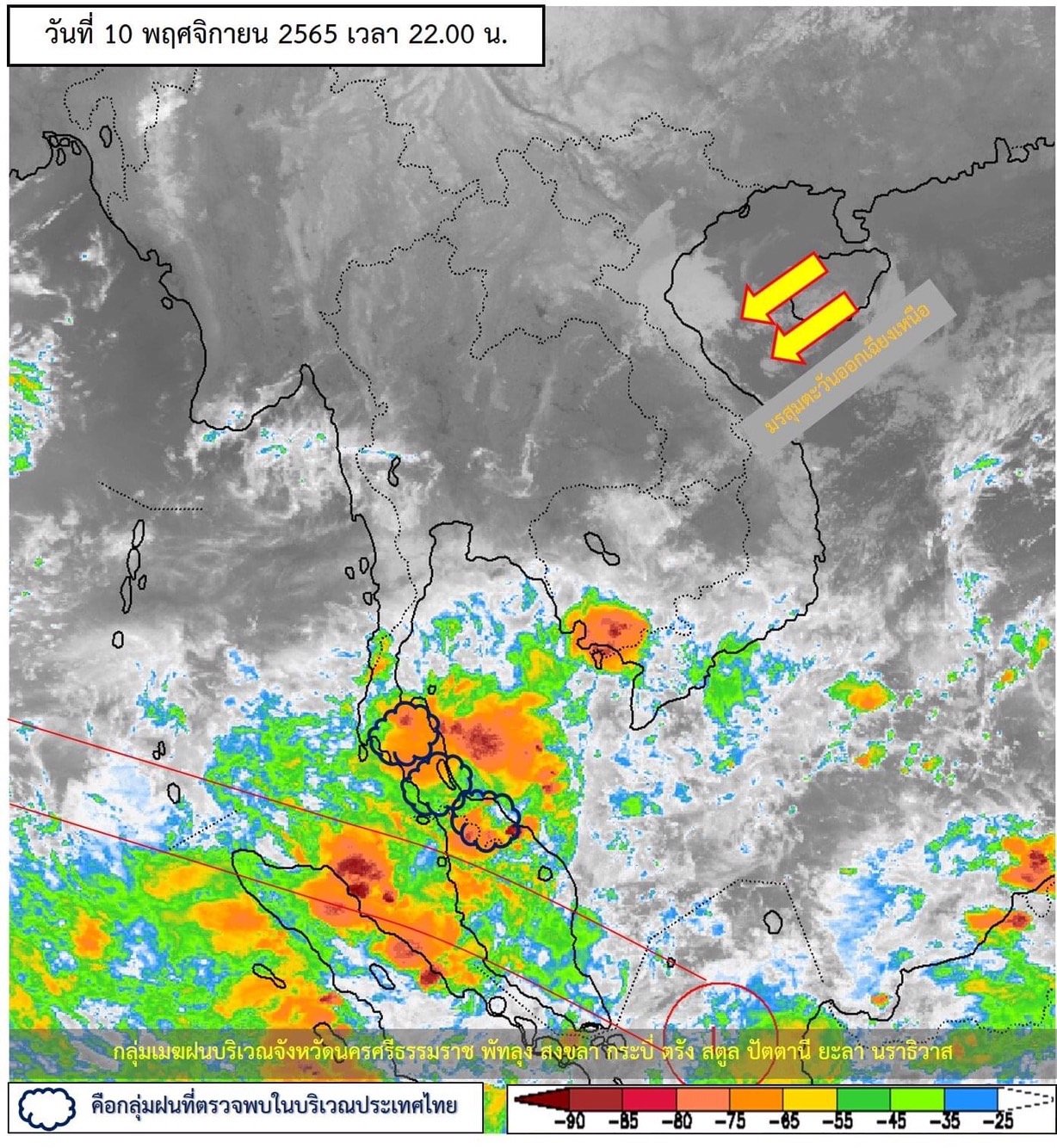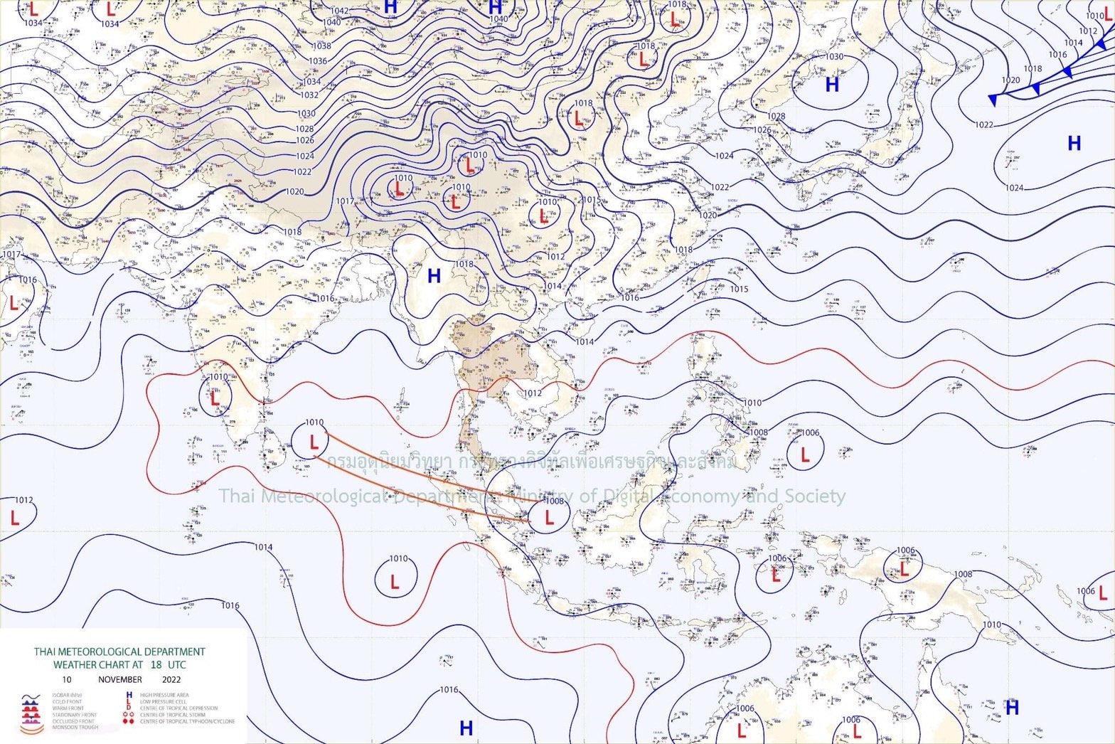 สำหรับร่องมรสุมพาดผ่านทางตอนล่างของภาคใต้ เข้าสู่หย่อมความกดอากาศต่ำที่ปกคลุมบริเวณด้านตะวันออกของประเทศมาเลเซีย ประกอบกับมรสุมตะวันออกเฉียงเหนือ ยังคงพัดปกคลุมอ่าวไทย ภาคใต้ และทะเลอันดามัน ลักษณะเช่นนี้ทำให้ภาคใต้ตอนล่าง มีฝนตกเพิ่มขึ้น และมีฝนตกหนักบางแห่ง ขอให้ประชาชนบริเวณดังกล่าว ระวังอันตรายจากฝนตกหนักและฝนที่ตกสะสม ซึ่งอาจทำให้เกิดน้ำท่วมฉับพลันและน้ำป่าไหลหลากได้