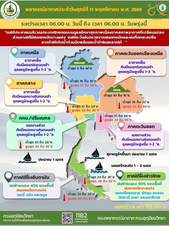 ลักษณะอากาศทั่วไป พยากรณ์อากาศ 24 ชั่วโมงข้างหน้า บริเวณความกดอากาศสูงหรือมวลอากาศเย็น ที่ปกคลุมประเทศไทยตอนบนเริ่มมีกำลังอ่อนลง ลักษณะเช่นนี้ทำให้ประเทศไทยตอนบน ยังคงมีอากาศเย็น กับมีหมอกในตอนเช้า และอุณหภูมิจะสูงขึ้น 1-3 องศาเซลเซียส ในภาคเหนือตอนล่าง ภาคตะวันออกเฉียงเหนือ ภาคกลางรวมทั้งกรุงเทพมหานครและปริมณฑล และภาคตะวันออก ขอให้ประชาชนในบริเวณดังกล่าว ดูแลรักษาสุขภาพเนื่องจากสภาพอากาศที่เปลี่ยนแปลงในระยะนี้ไว้ด้วย