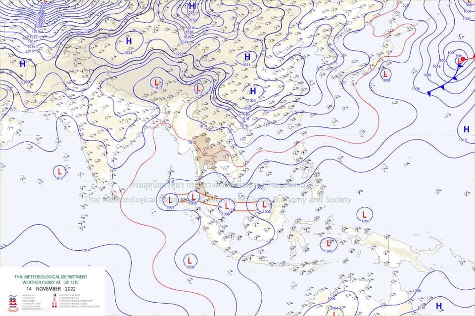 ลักษณะอากาศทั่วไป พยากรณ์อากาศ 24 ชั่วโมงข้างหน้า ร่องมรสุมพาดผ่านภาคใต้ตอนล่าง ในขณะที่หย่อมความกดอากาศต่ำ ปกคลุมบริเวณทะเลอันดามันตอนล่าง และหัวเกาะสุมาตรา ประกอบกับมรสุมตะวันออกเฉียงเหนือ ยังคงพัดปกคลุมอ่าวไทยตอนบน ลักษณะเช่นนี้ทำให้ภาคใต้มีฝนตกต่อเนื่อง และมีฝนตกหนักถึงหนักมากบางแห่ง ขอให้ประชาชนบริเวณดังกล่าว ระวังอันตรายจากฝนตกหนักและฝนที่ตกสะสมซึ่งอาจทำให้เกิดน้ำท่วมฉับพลันและน้ำป่าไหลหลาก โดยเฉพาะพื้นที่ลาดเชิงเขาใกล้ทางน้ำไหลผ่านและพื้นที่ลุ่มไว้ด้วย