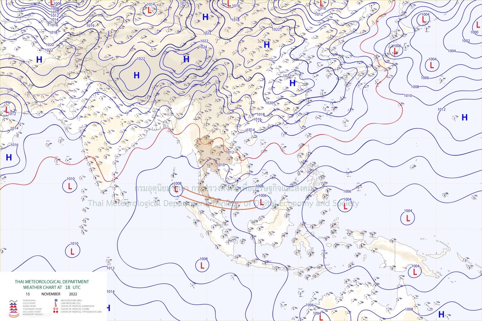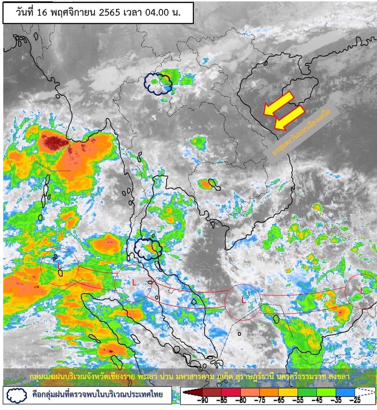 ลักษณะอากาศทั่วไป พยากรณ์อากาศ 24 ชั่วโมงข้างหน้า ร่องมรสุมพาดผ่านภาคใต้ตอนล่าง ประกอบกับลมตะวันออกยังคงพัดปกคลุมอ่าวไทยและภาคใต้ ลักษณะเช่นนี้ทำให้ภาคใต้มีฝนตกต่อเนื่อง และมีฝนตกหนักบางแห่ง ขอให้ประชาชนบริเวณดังกล่าว ระวังอันตรายจากฝนตกหนักและฝนที่ตกสะสม ซึ่งอาจทำให้เกิดน้ำท่วมฉับพลัน น้ำป่าไหลหลาก และน้ำล้นตลิ่ง โดยเฉพาะพื้นที่ลาดเชิงเขาใกล้ทางน้ำไหลผ่านและพื้นที่ลุ่มไว้ด้วย สำหรับบริเวณความกดอากาศสูง หรือมวลอากาศเย็นกำลังอ่อน ปกคลุมประเทศไทยตอนบนและทะเลจีนใต้ ส่งผลให้มีลมตะวันออกและลมตะวันออกเฉียงใต้ พัดนำความชื้นจากทะเลเข้ามาปกคลุมภาคตะวันออกเฉียงเหนือตอนล่าง ภาคกลาง รวมทั้งกรุงเทพมหานครและปริมณฑล และภาคตะวันออก ทำให้บริเวณดังกล่าวมีฝนฟ้าคะนองเกิดขึ้นเกิดขึ้นได้บางพื้นที่ สำหรับภาคเหนือและภาคตะวันออกเฉียงเหนือตอนบน ยังคงมีอากาศเย็นในตอนเช้า ขอให้ประชาชนในบริเวณประเทศไทยตอนบน ดูแลรักษาสุขภาพเนื่องจากสภาพอากาศที่เปลี่ยนแปลงไว้ด้วย