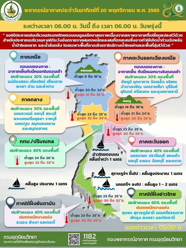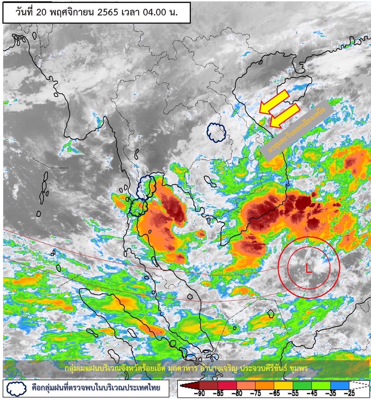 อนึ่ง หย่อมความกดอากาศต่ำกำลังแรงบริเวณทะเลจีนใต้ตอนล่าง คาดว่าจะเคลื่อนผ่านปลายแหลมญวนในวันที่ 21 – 22 พ.ย. 65 และเข้าสู่อ่าวไทย ในช่วงวันที่ 23 – 24 พ.ย. 65 ประกอบกับร่องมรสุมพาดผ่านภาคใต้เข้าสู่หย่อมความกดอากาศต่ำกำลังแรงบริเวณปลายแหลมญวน ส่งผลให้ในช่วงวันที่ 21 – 24 พ.ย. 65 บริเวณภาคตะวันออกเฉียงเหนือตอนล่าง ภาคกลาง กรุงเทพมหานครและปริมณฑล ภาคตะวันออก และภาคใต้ มีฝนตกหนักถึงหนักมากบางแห่ง