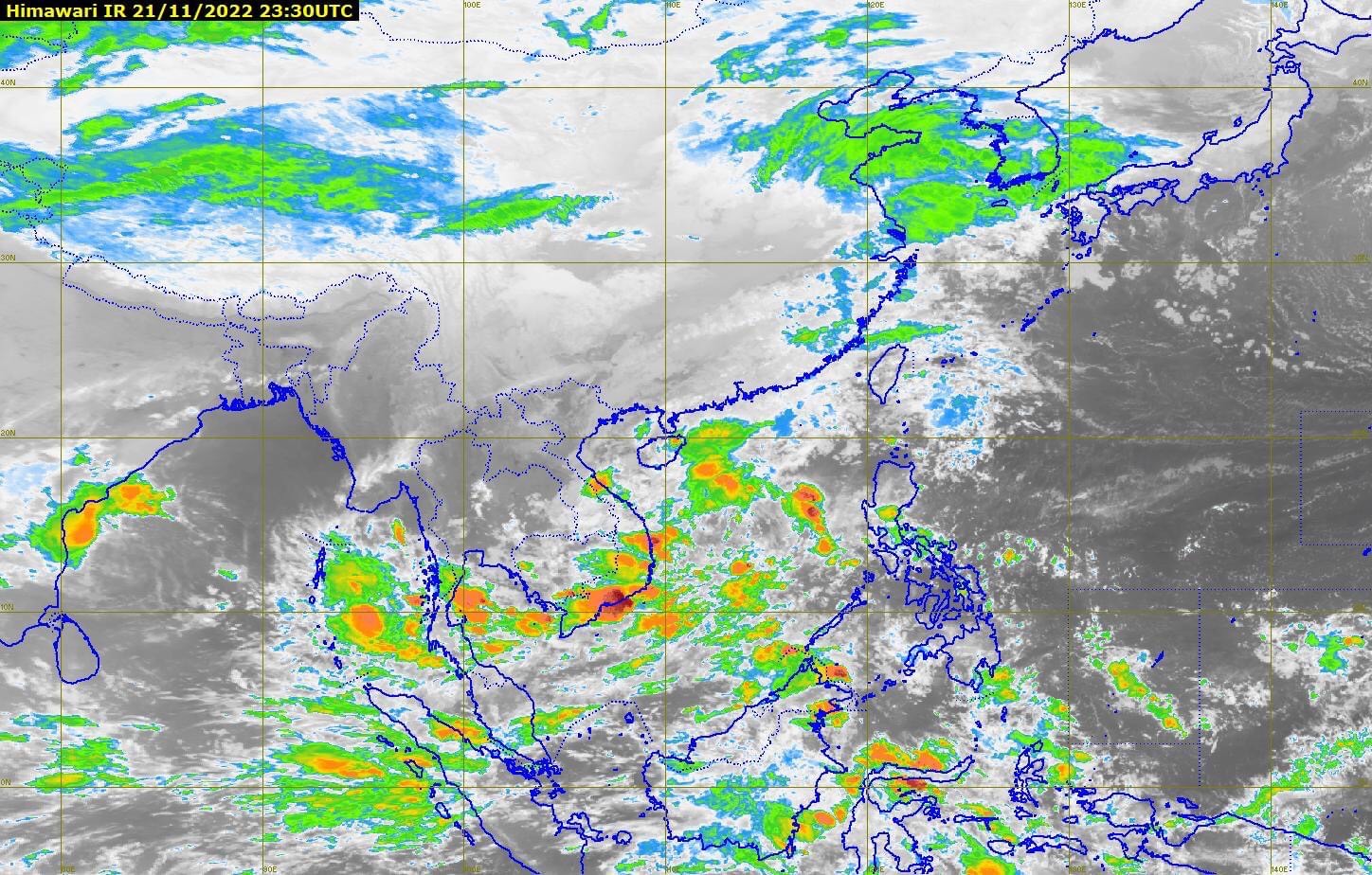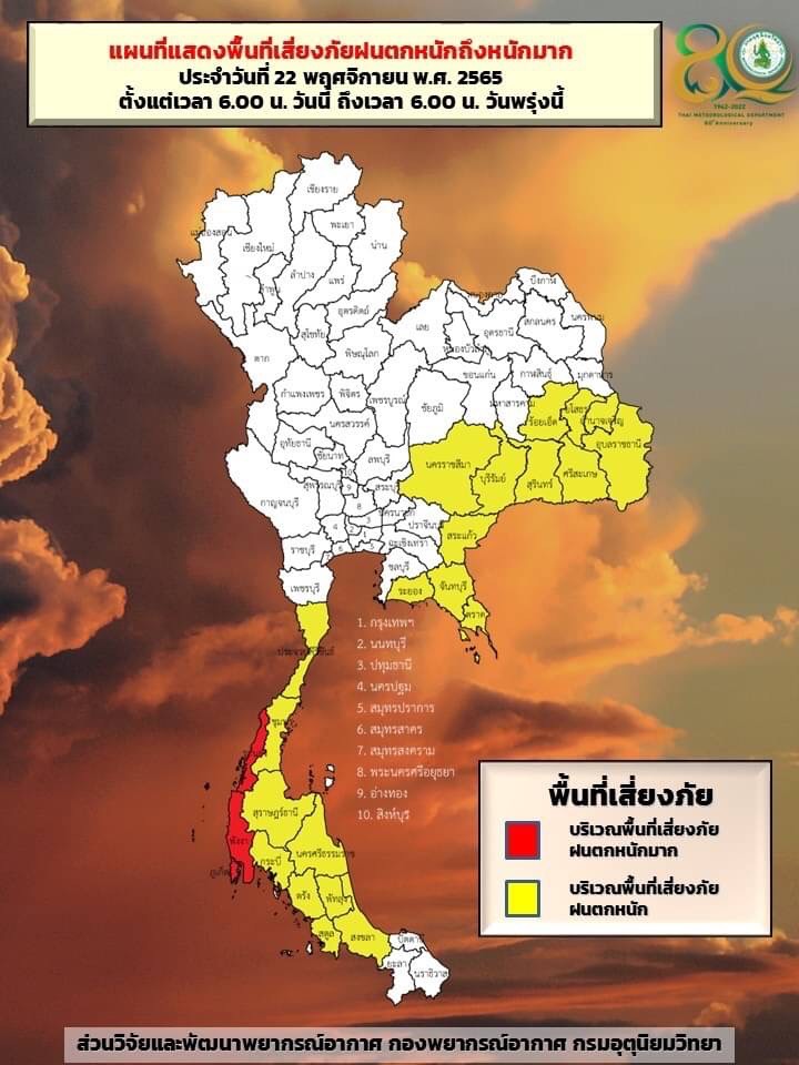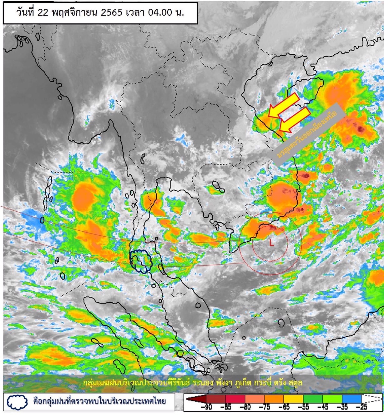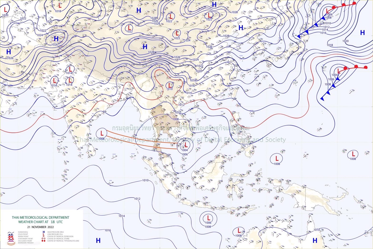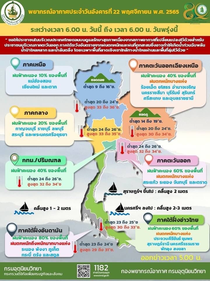 ลักษณะอากาศทั่วไป พยากรณ์อากาศ 24 ชั่วโมงข้างหน้า หย่อมความกดอากาศต่ำกำลังแรง ปกคลุมบริเวณชายฝั่งประเทศเวียดนามตอนล่าง มีแนวโน้มจะเคลื่อนผ่านปลายแหลมญวน และเข้าสู่อ่าวไทยในช่วงวันที่ 22-23 พ.ย. 65 ประกอบกับร่องมรสุมพาดผ่านภาคใต้ตอนกลาง ลักษณะเช่นนี้ทำให้ภาคตะวันออกเฉียงเหนือตอนล่าง ภาคตะวันออก และภาคใต้ฝั่งตะวันออกมีฝนตกหนักบางแห่ง โดยมีฝนตกหนักมากในภาคใต้ฝั่งตะวันตก ขอให้ประชาชนบริเวณดังกล่าว ระวังอันตรายจากฝนตกหนักถึงหนักมากและฝนที่ตกสะสม ซึ่งอาจทำให้เกิดน้ำท่วมฉับพลัน น้ำป่าไหลหลาก และน้ำล้นตลิ่ง โดยเฉพาะพื้นที่ลาดเชิงเขาใกล้ทางน้ำไหลผ่านและพื้นที่ลุ่ม สำหรับลมตะวันออกและลมตะวันออกเฉียงใต้ในระดับบน ยังคงพัดปกคลุมประเทศไทยตอนบน ส่งผลให้ภาคเหนือ ภาคตะวันออกเฉียงเหนือตอนล่าง ภาคกลางรวมทั้งกรุงเทพมหา นครและปริมณฑล มีฝนฟ้าคะนองเกิดขึ้นได้บางพื้นที่ ขอให้ประชาชนบริเวณประเทศไทยตอนบน ดูแลรักษาสุขภาพเนื่องจากสภาพอากาศที่เปลี่ยนแปลงไว้ด้วย