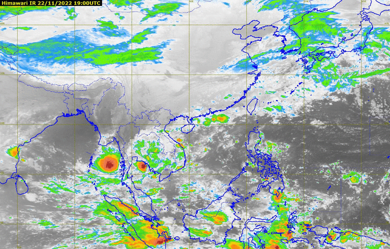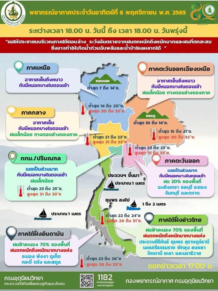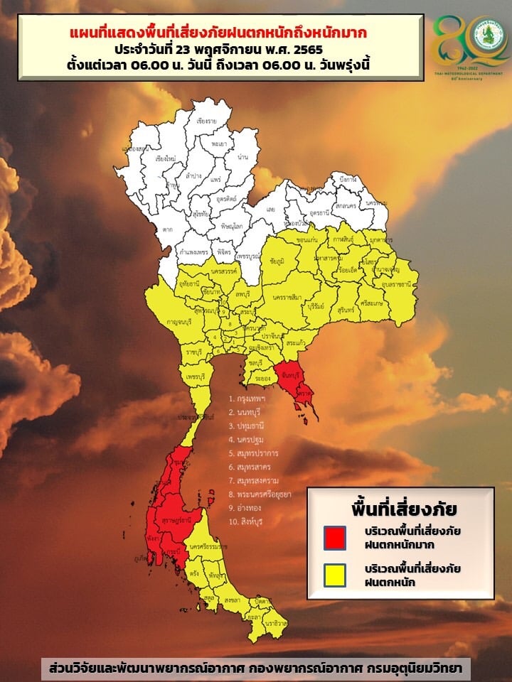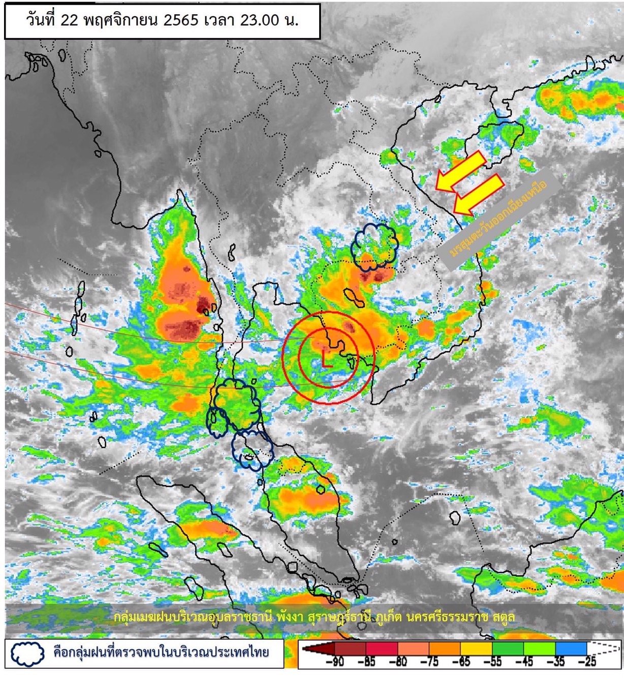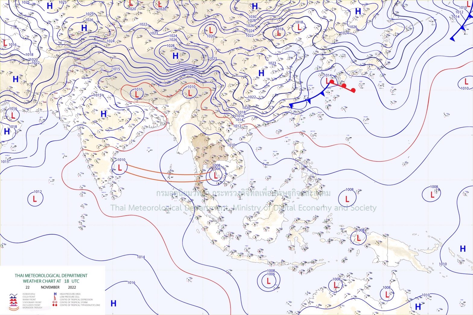 ลักษณะอากาศทั่วไป พยากรณ์อากาศ 24 ชั่วโมงข้างหน้า หย่อมความกดอากาศต่ำกำลังแรงปกคลุมประเทศกัมพูชาตอนล่าง มีแนวโน้มจะเคลื่อนเข้าสู่อ่าวไทยในวันที่ 23 พ.ย. 65 ประกอบกับร่องมรสุมพาดผ่านภาคใต้ตอนบน ลักษณะเช่นนี้ทำให้ประเทศไทยตอนบนมีฝนตกหนักบางแห่ง และมีฝนตกหนักถึงหนักมากบริเวณภาคตะวันออก และภาคใต้ ขอให้ประชาชนบริเวณดังกล่าวระวังอันตรายจากฝนตกหนักถึงหนักมากและฝนที่ตกสะสมซึ่งอาจทำให้เกิดน้ำท่วมฉับพลัน น้ำป่าไหลหลาก และน้ำล้นตลิ่ง โดยเฉพาะพื้นที่ลาดเชิงเขาใกล้ทางน้ำไหลผ่านและพื้นที่ลุ่ม