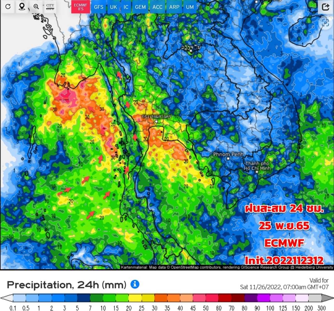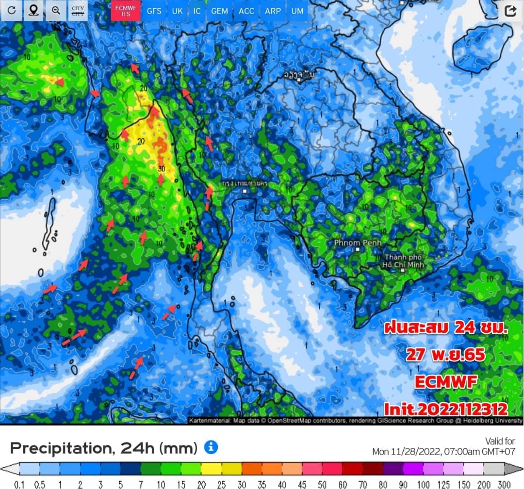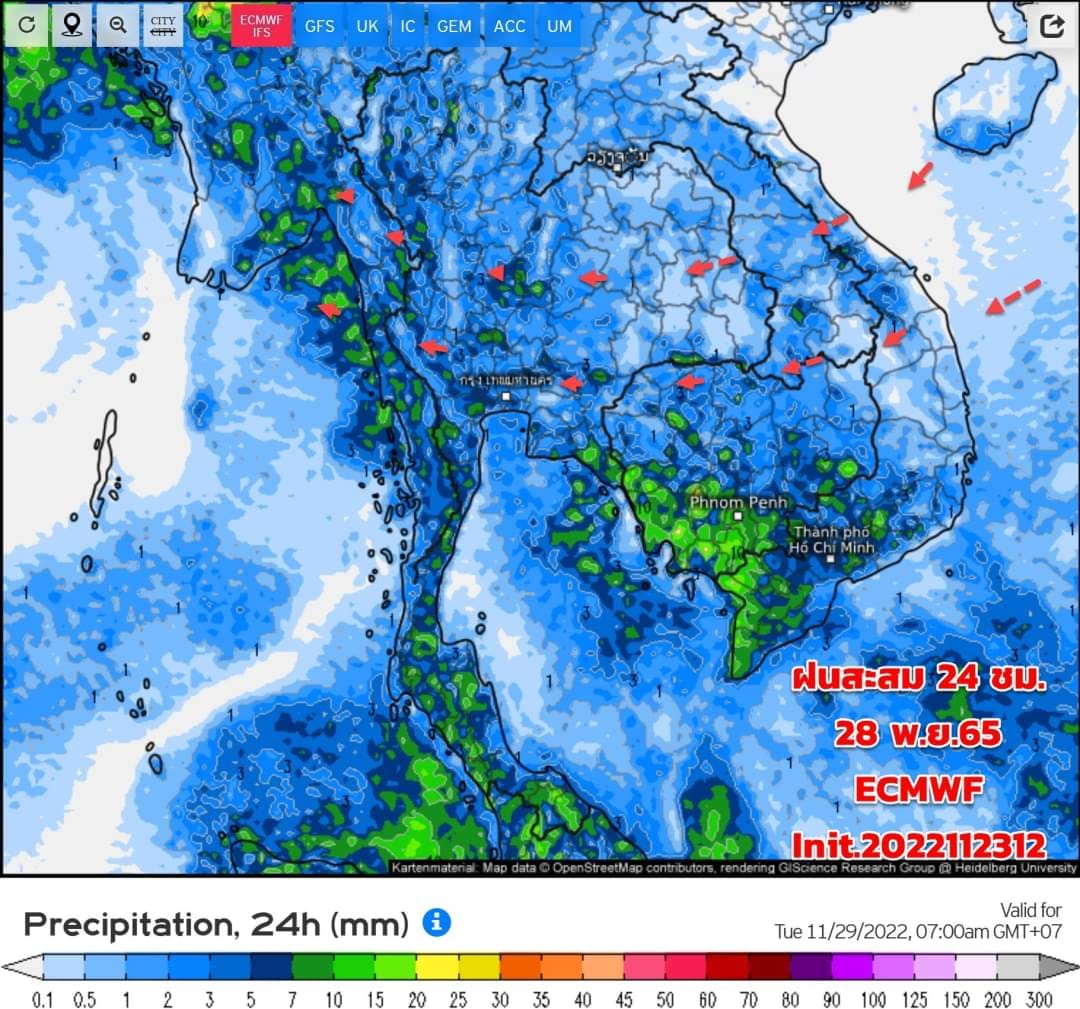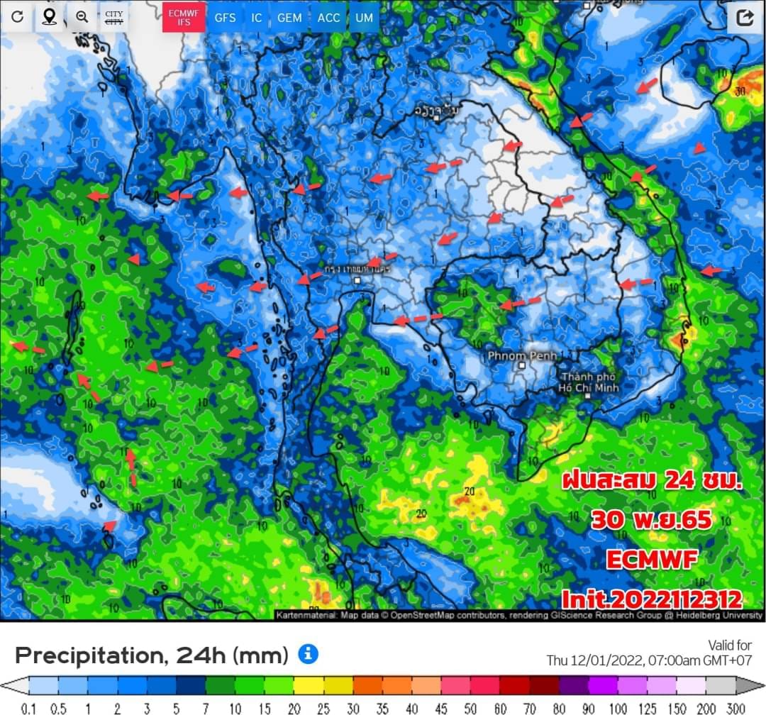 พยากรณ์ฝนรายวัน (ทุกๆ 24 ชม.) ระหว่าง 24 พ.ย.-3 ธ.ค. 65 อัพเดท 2022112312 จากศูนย์พยากรณ์อากาศระยะกลางยุโรป (ECMWF) :