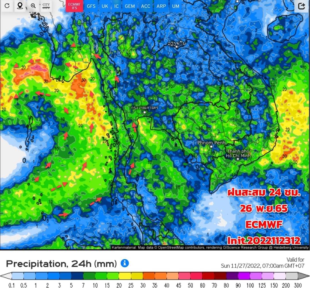 ส่วนฝนบริเวณประเทศไทยจะเริ่มลดลงหลังวันที่ 27 พ.ย.65 อากาศจะเริ่มเย็นลง
