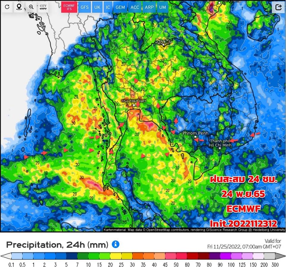 ช่วง 24-26 พ.ย.65 : หย่อมความกดอากาศต่ำกำลังแรงปกคลุมภาคตะวันออก อ่าวไทยและภาคใต้ตอนบนของไทย ซึ่งจะทำให้ประเทศไทยยังมีฝนตกต่อเนื่องและมีฝนตกหนักบางแห่ง โดยเฉพาะบริเวณภาคเหนือตอนล่าง ภาคอีสานตอนล่าง ภาคกลาง (รวม กทม.และปริมณฑล) ภาคตะวันออก ในช่วงวันที่ 24 – 25 พ.ย.65 ประกอบกับยังมีมวลอากาศเย็นแผ่ลงมาปกคลุมภาคเหนือ ภาคอีสานตอนบน ต้องเฝ้าระวังฝนตกหนัก โดยเฉพาะพี่น้องเกษตรกรที่กำลังเก็บเกี่ยวและตากผลผลิต ต้องหาวิธิป้องกันความเสียหายที่อาจจะเิกดขึ้นได้ในระยะนี้
