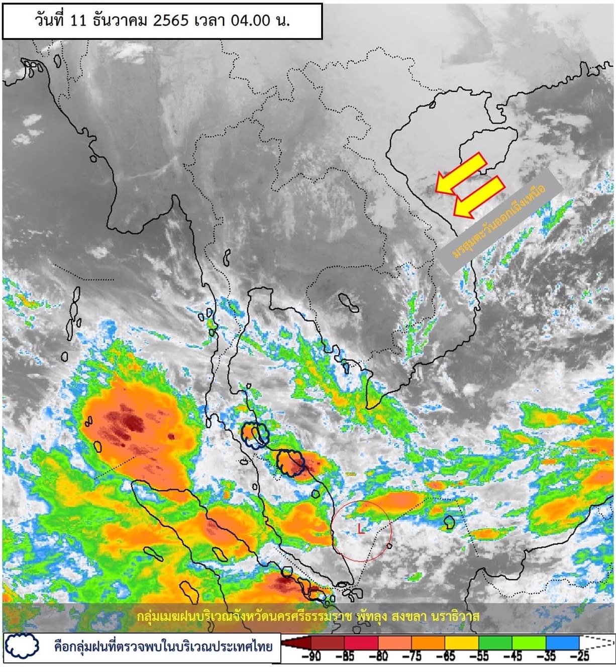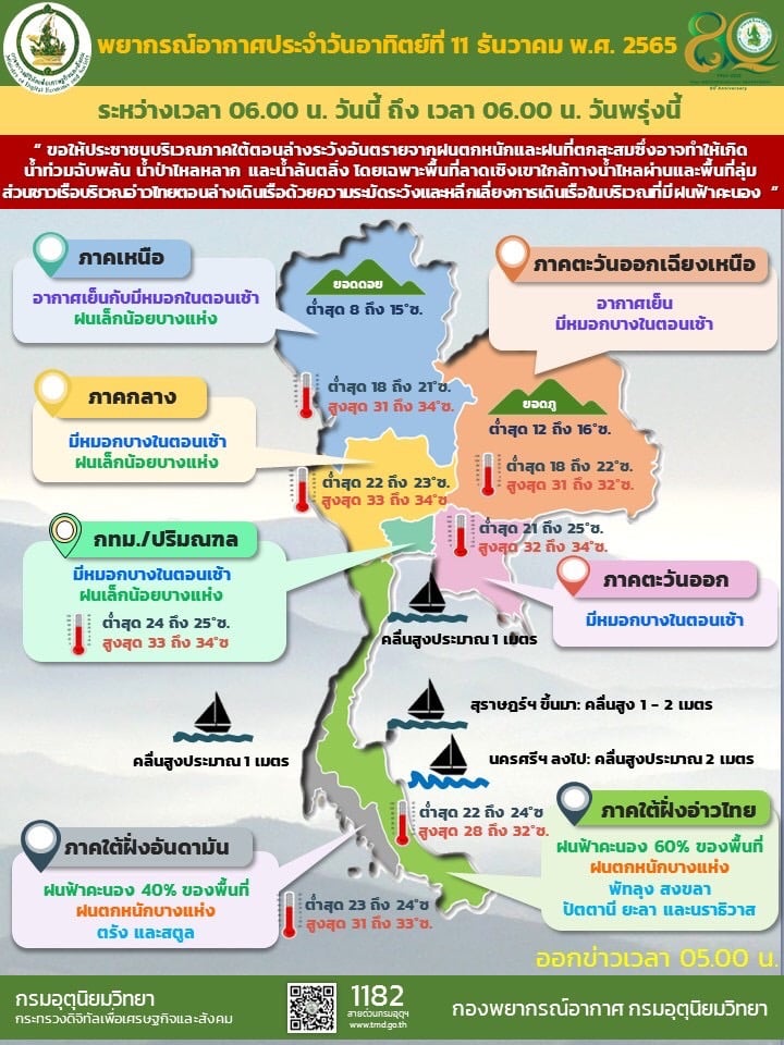 ลักษณะอากาศทั่วไป พยากรณ์อากาศ 24 ชั่วโมงข้างหน้า หย่อมความกดอากาศต่ำปกคลุมบริเวณประเทศมาเลเซียและช่องแคบมะละกา ประกอบกับมรสุมตะวันออกเฉียงเหนือกำลังปานกลางยังคงพัดปกคลุมอ่าวไทย ภาคใต้ และทะเลอันดามัน ทำให้ภาคใต้ตอนล่างมีฝนตกหนักบางแห่ง ขอให้ประชาชนในบริเวณดังกล่าวระวังอันตรายจากฝนตกหนักและฝนที่ตกสะสม ซึ่งอาจทำให้เกิดน้ำท่วมฉับพลัน น้ำป่าไหลหลาก และน้ำล้นตลิ่ง โดยเฉพาะพื้นที่ลาดเชิงเขาใกล้ทางน้ำไหลผ่านและพื้นที่ลุ่ม ส่วนคลื่นลมบริเวณอ่าวไทยตอนล่างมีกำลังปานกลาง โดยมีคลื่นสูงประมาณ 2 เมตร บริเวณที่มีฝนฟ้าคะนองคลื่นสูงมากกว่า 2 เมตร ขอให้ชาวเรือในบริเวณดังกล่าวเดินเรือด้วยความระมัดระวังและหลีกเลี่ยงการเดินเรือในบริเวณที่มีฝนฟ้าคะนอง
