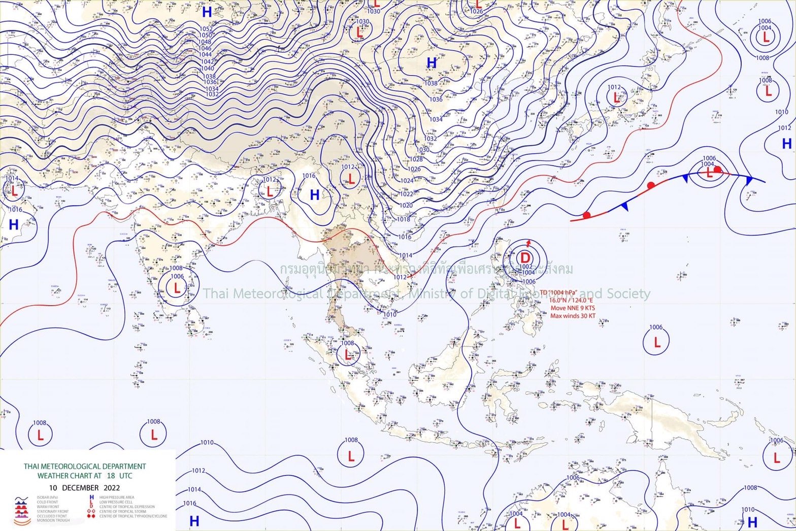 อนึ่ง บริเวณความกดอากาศสูงหรือมวลอากาศเย็นกำลังค่อนข้างแรงอีกระลอกหนึ่งได้แผ่ลงมาปกคลุมประเทศเวียดนามตอนบนแล้ว คาดว่าจะแผ่ลงมาปกคลุมประเทศไทยบนในวันที่ 12-15 ธ.ค. 2565 ลักษณะเช่นนี้จะทำให้ประเทศไทยตอนบนมีอุณภูมิลดลง กับมีลมแรง โดยภาคตะวันออกเฉียงเหนืออุณหภูมิจะลดลง 4 – 6 องศาเซลเซียส ส่วนภาคเหนือ ภาคกลาง และภาคตะวันออก อุณหภูมิจะลดลง 3 – 5 องศาเซลเซียส