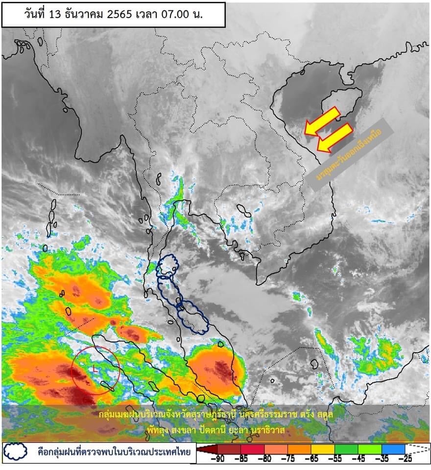 ภาคใต้(ฝั่งตะวันออก) ตอนบนของภาค อากาศเย็นในตอนเช้า ตอนล่างของภาค มีฝนฟ้าคะนองร้อยละ 40 ของพื้นที่ และมีฝนตกหนักบางแห่ง บริเวณจังหวัดนครศรีธรรมราช สงขลา ปัตตานี ยะลา และนราธิวาส อุณหภูมิต่ำสุด 21-24 องศาเซลเซียส อุณหภูมิสูงสุด 29-31 องศาเซลเซียส ตั้งแต่จังหวัดสุราษฎร์ธานีขึ้นมา ลม ตะวันออกเฉียงเหนือ ความเร็ว 15-35 กม./ชม. ทะเลมีคลื่นสูง 1-2 เมตร บริเวณที่มีฝนฟ้าคะนองคลื่นสูงระมาณ 2 เมตร ตั้งแต่จังหวัดนครศรีธรรมราชลงไป ลมตะวันออก ความเร็ว 20-35 กม./ชม. ทะเลมีคลื่นสูงประมาณ 2 เมตร บริเวณที่มีฝนฟ้าคะนองคลื่นสูงมากกว่า 2 เมตร