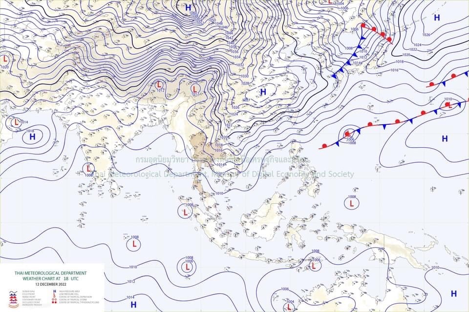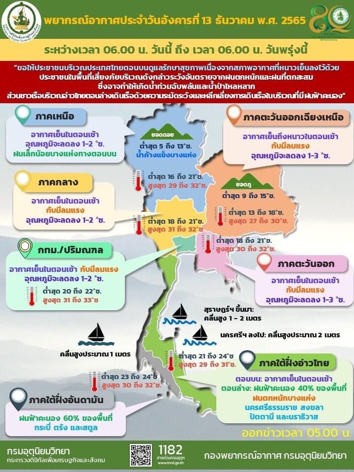 ลักษณะอากาศทั่วไป พยากรณ์อากาศ 24 ชั่วโมงข้างหน้า บริเวณความกดอากาศสูงหรือมวลอากาศเย็นกำลังค่อนข้างแรงจากประเทศจีนได้แผ่ปกคลุมประเทศไทยตอนบน ทำให้บริเวณดังกล่าวมีอากาศเย็นในตอนเช้า อุณภูมิจะลดลงกับมีลมแรง โดยอุณหภูมิจะลดลง 1-3 องศาเซลเซียสในภาคตะวันออกเฉียงเหนือและภาคตะวันออก ส่วนภาคเหนือ ภาคกลางรวมทั้งกรุงเทพมหานครและปริมณฑลอุณหภูมิจะลดลง 1-2 องศาเซลเซียส ขอให้ประชาชนบริเวณประเทศไทยตอนบนดูแลรักษาสุขภาพเนื่องจากสภาพอากาศที่หนาวเย็นลงไว้ด้วย