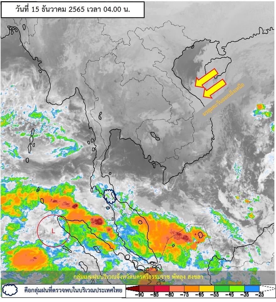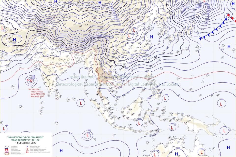 สำหรับมรสุมตะวันออกเฉียงเหนือกำลังค่อนข้างแรง พัดปกคลุมอ่าวไทย ภาคใต้ และทะเลอันดามัน ทำให้คลื่นลมบริเวณอ่าวไทยมีกำลังค่อนข้างแรง โดยอ่าวไทยตอนล่างมีคลื่นสูง 2-3 เมตร บริเวณที่มีฝนฟ้าคะนองคลื่นสูงมากกว่า 3 เมตร ชาวเรือในบริเวณดังกล่าว ควรเดินเรือด้วยความระมัดระวังและหลีกเลี่ยงการเดินเรือบริเวณที่มีฝนฟ้าคะนอง ส่วนเรือเล็กบริเวณอ่าวไทยตอนล่าง ควรงดออกจากฝั่งในระยะนี้