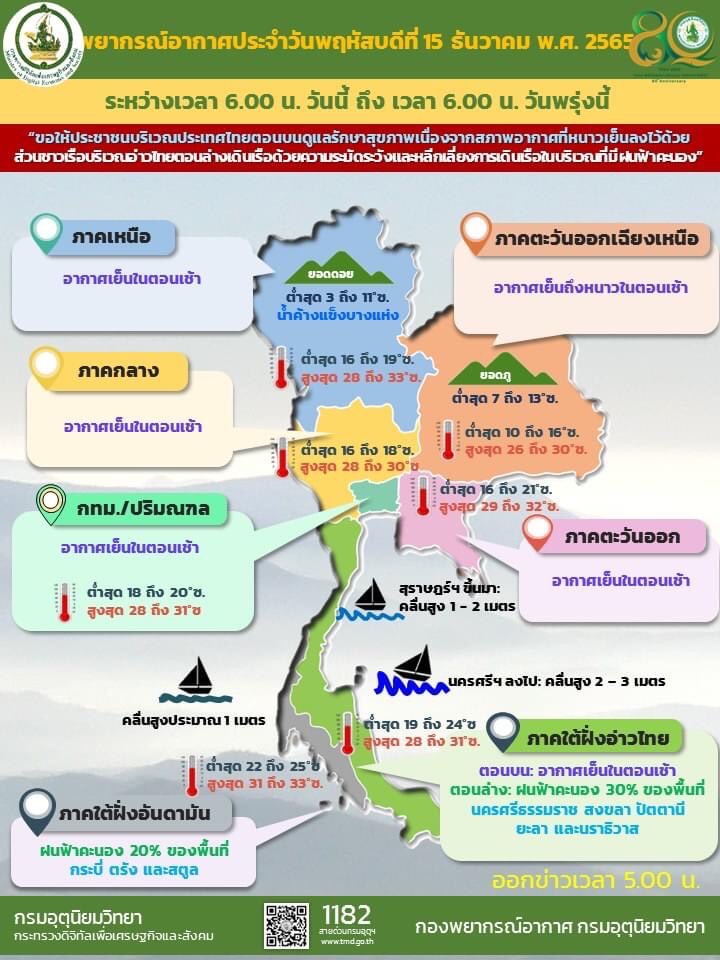 ภาคเหนือ อากาศเย็นในตอนเช้า อุณหภูมิต่ำสุด 17-20 องศาเซลเซียส อุณหภูมิสูงสุด 28-33 องศาเซลเซียส บริเวณยอดดอยอากาศหนาวถึงหนาวจัด และมีน้ำค้างแข็งบางแห่ง อุณหภูมิต่ำสุด 6-12 องศาเซลเซียส ลมตะวันออกเฉียงเหนือ ความเร็ว 10-15 กม./ชม.