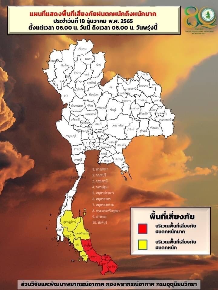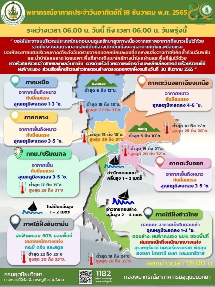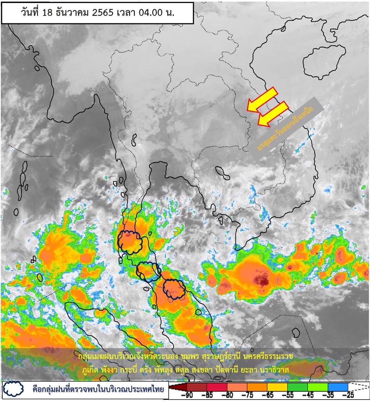 สำหรับมรสุมตะวันออกเฉียงเหนือที่พัดปกคลุมอ่าวไทย ภาคใต้ และทะเลอันดามัน มีกำลังแรงขึ้น ทำให้ภาคใต้มีฝนเพิ่มขึ้นและมีฝนตกหนักถึงหนักมากบางแห่ง ส่วนคลื่นลมบริเวณอ่าวไทยมีกำลังแรงขึ้น โดยอ่าวไทยและห่างฝั่งบริเวณทะเลอันดามันคลื่นสูง 2-4 เมตร บริเวณที่มีฝนฟ้าคะนองคลื่นสูงมากกว่า 4 เมตร ชาวเรือในบริเวณดังกล่าวควรเดินเรือด้วยความระมัดระวังและหลีกเลี่ยงการเดินเรือบริเวณที่มีฝนฟ้าคะนอง ส่วนเรือเล็กบริเวณอ่าวไทยตอนล่างควรงดออกจากฝั่งจนถึงวันที่ 20 ธันวาคม 2565