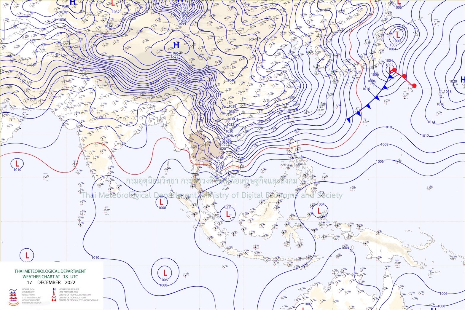 ลักษณะอากาศทั่วไป พยากรณ์อากาศ 24 ชั่วโมงข้างหน้า บริเวณความกดอากาศสูงหรือมวลอากาศเย็นกำลังแรงจากประเทศจีนได้แผ่ลงมาปกคลุมประเทศไทยตอนบนแล้ว ทำให้บริเวณประเทศไทยตอนบนมีอากาศเย็นถึงหนาว และอุณหภูมิจะลดลงกับมีลมแรง โดยบริเวณภาคเหนือ และภาคตะวันออกเฉียงเหนืออุณหภูมิจะลดลง 6 – 8 องศาเซลเซียส ส่วนภาคกลาง รวมทั้งกรุงเทพมหานครและปริมณฑล และภาคตะวันออก อุณหภูมิจะลดลง 4 – 6 องศาเซลเซียส ขอให้ประชาชนบริเวณประเทศไทยตอนบนดูแลรักษาสุขภาพเนื่องจากสภาพอากาศที่หนาวเย็นไว้ด้วย รวมถึงระวังอันตรายจากอัคคีภัยที่อาจเกิดขึ้นเนื่องจากอากาศแห้งและมีลมแรง