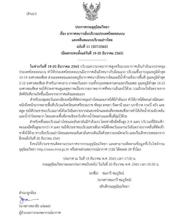 กรมอุตุนิยมวิทยา ประกาศเรื่อง อากาศหนาวเย็นบริเวณประเทศไทยตอนบน และคลื่นลมแรงบริเวณอ่าวไทย ฉบับที่ 11 (357/2565) (มีผลกระทบตั้งแต่วันที่ 19-20 ธันวาคม 2565)