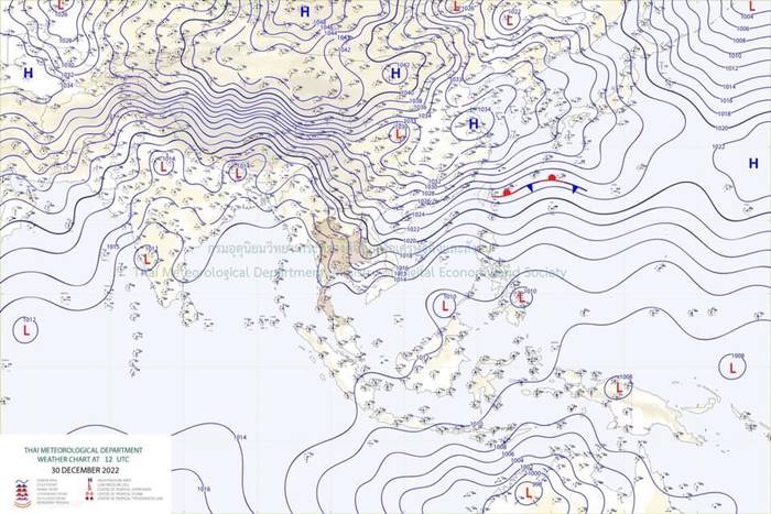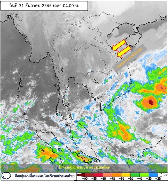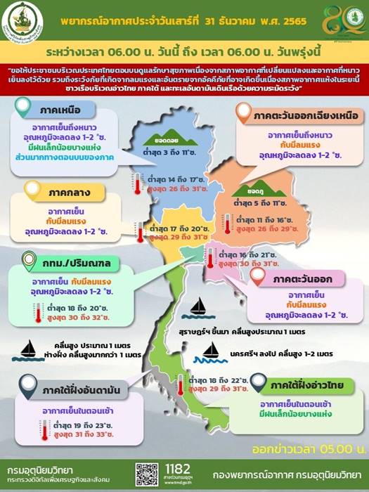 ลักษณะอากาศทั่วไป พยากรณ์อากาศ 24 ชั่วโมงข้างหน้า บริเวณความกดอากาศสูงหรือมวลอากาศเย็นกำลังค่อนข้างแรงปกคลุมประเทศไทย ทำให้บริเวณดังกล่าวมีอากาศเย็นถึงหนาวกับมีลมแรง และอุณหภูมิจะลดลงอีก 1-2 องศาเซลเซียส ขอให้ประชาชนบริเวณประเทศไทยตอนบนดูแลรักษาสุขภาพเนื่องจากสภาพอากาศที่เปลี่ยนแปลงและอากาศที่หนาวเย็นลงไว้ด้วย รวมถึงระวังอันตรายจากอัคคีภัยที่เกิดจากสภาพอากาศแห้งและมีลมแรงในระยะนี้