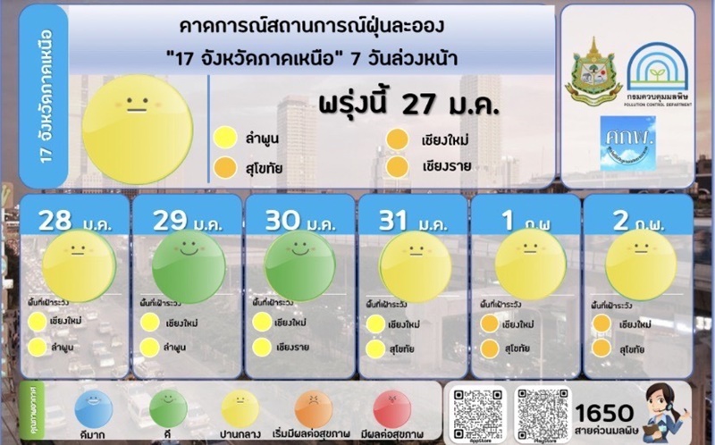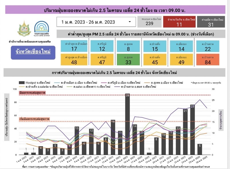 สรุปสถานการณ์ฝุ่น PM2.5 ประจำวันที่ 26 มกราคม 2566 ในพื้นที่รับผิดชอบของสำนักงานสิ่งแวดล้อมและควบคุมมลพิษที่ 1 (เชียงใหม่ เชียงราย ลำพูน แม่ฮ่องสอน)