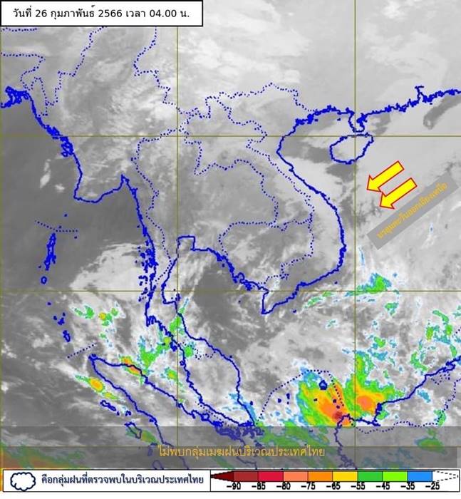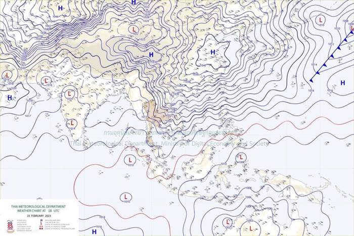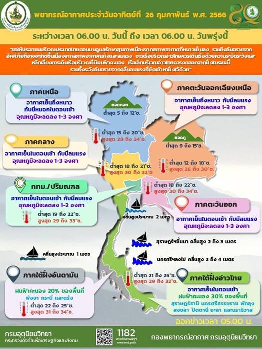 ลักษณะอากาศทั่วไป พยากรณ์อากาศ 24 ชั่วโมงข้างหน้า บริเวณความกดอากาศสูงหรือมวลอากาศเย็นกำลังแรงจากประเทศจีนปกคลุมประเทศไทยตอนบน ลักษณะเช่นนี้ทำให้ประเทศไทยตอนบนมีอากาศหนาวเย็นลงกับมีลมแรง และอุณหภูมิจะลดลงอีก 1-3 องศาเซลเซียส โดยภาคเหนือและภาคตะวันออกเฉียงเหนือมีอากาศเย็นถึงหนาว ส่วนภาคกลางรวมทั้งกรุงเทพมหานครและปริมณฑล และภาคตะวันออก มีอากาศเย็นในตอนเช้า ขอให้ประชาชนในบริเวณดังกล่าวดูแลรักษาสุขภาพเนื่องจากสภาพอากาศที่หนาวเย็นลง รวมถึงระวังอันตรายจากอัคคีภัยที่อาจจะเกิดขึ้นเนื่องจากสภาพอากาศแห้งและลมแรง