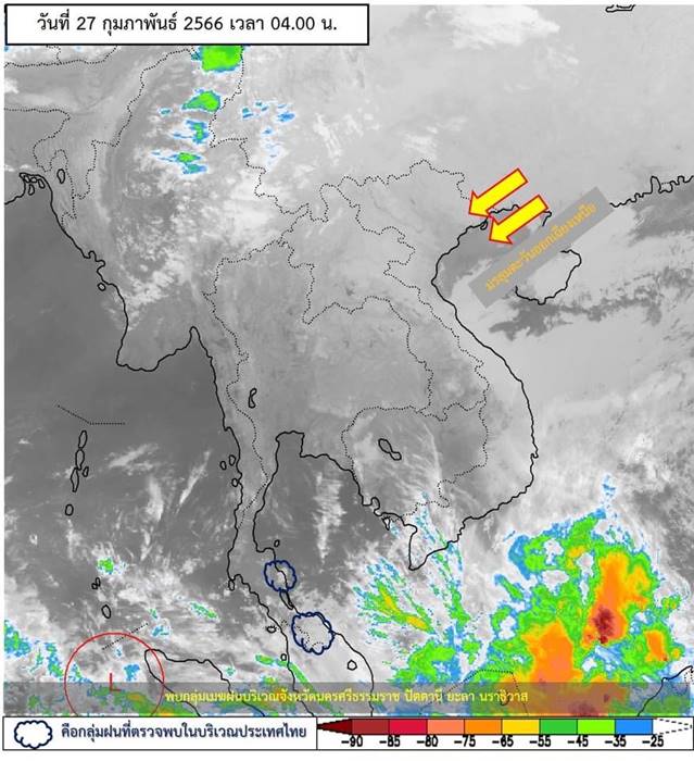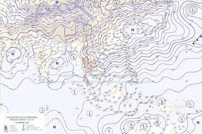 ลักษณะอากาศทั่วไป พยากรณ์อากาศ 24 ชั่วโมงข้างหน้า บริเวณความกดอากาศสูงหรือมวลอากาศเย็นกำลังแรงจากประเทศจีนปกคลุมประเทศไทยตอนบน ลักษณะเช่นนี้ทำให้ประเทศไทยตอนบนมีอากาศหนาวเย็นกับมีลมแรง อุณหภูมิจะลดลงอีก 1-3 องศาเซลเซียส โดยภาคเหนือและภาคตะวันออกเฉียงเหนือมีอากาศเย็นถึงหนาว ส่วนภาคกลางรวมทั้งกรุงเทพมหานครและปริมณฑล และภาคตะวันออก มีอากาศเย็นในตอนเช้า ขอให้ประชาชนในบริเวณดังกล่าวดูแลรักษาสุขภาพเนื่องจากสภาพอากาศที่หนาวเย็นลง รวมถึงระวังอันตรายจากอัคคีภัยที่อาจจะเกิดขึ้นเนื่องจากสภาพอากาศแห้งและลมแรง