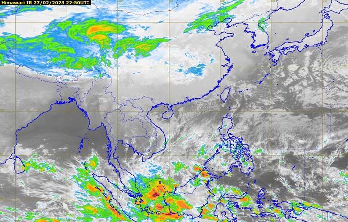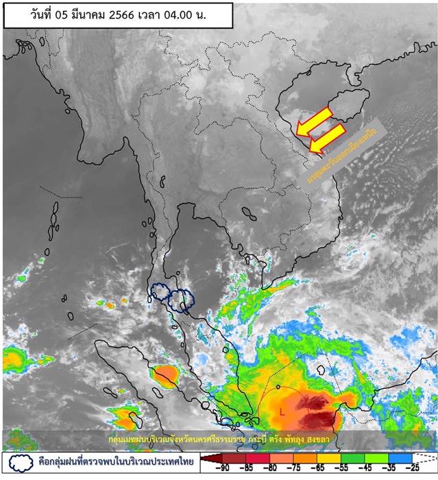 สำหรับมรสุมตะวันออกเฉียงเหนือกำลังปานกลางพัดปกคลุมอ่าวไทยและภาคใต้ ทำให้ภาคใต้ตอนล่างยังคงมีฝนฟ้าคะนองบางแห่งเกิดขึ้นได้ ขอให้ประชาชนในบริเวณดังกล่าวระวังอันตรายจากฝนฟ้าคะนอง ส่วนคลื่นลมบริเวณอ่าวไทยตอนล่างมีคลื่นสูงประมาณ 2 เมตร บริเวณที่มีฝนฟ้าคะนองคลื่นสูงมากกว่า 2 เมตร ขอให้ชาวเรือบริเวณอ่าวไทยตอนล่างเดินเรือด้วยความระมัดระวัง และหลีกเลี่ยงการเดินเรือในบริเวณที่มีฝนฟ้าคะนอง รวมทั้งระวังอันตรายจากคลื่นลมแรงที่ซัดเข้าหาฝั่งไว้ด้วย