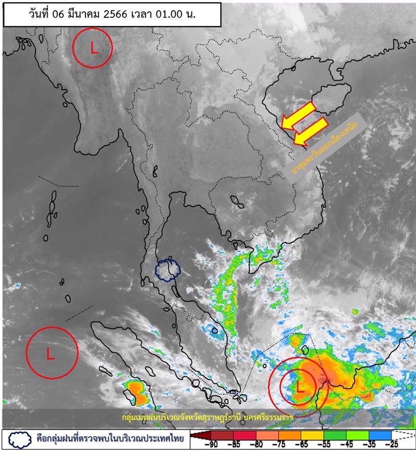 สำหรับลมตะวันออกพัดปกคลุมอ่าวไทยและภาคใต้ ทำให้ภาคใต้มีฝนฟ้าคะนองบางแห่งเกิดขึ้นได้ ขอให้ประชาชนในบริเวณดังกล่าวระวังอันตรายจากฝนฟ้าคะนอง ส่วนคลื่นลมบริเวณอ่าวไทยตอนล่างมีคลื่นสูงประมาณ 2 เมตร บริเวณที่มีฝนฟ้าคะนองคลื่นสูงมากกว่า 2 เมตร ขอให้ชาวเรือบริเวณอ่าวไทยตอนล่างเดินเรือด้วยความระมัดระวัง และหลีกเลี่ยงการเดินเรือในบริเวณที่มีฝนฟ้าคะนอง รวมทั้งระวังอันตรายจากคลื่นลมแรงที่ซัดเข้าหาฝั่งไว้ด้วย