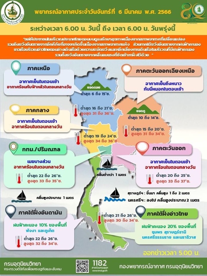 ภาคเหนือ อากาศเย็นในตอนเช้า โดยมีอากาศร้อนกับมีฟ้าหลัวในตอนกลางวัน อุณหภูมิต่ำสุด 16-21 องศาเซลเซียส อุณหภูมิสูงสุด 31-36 องศาเซลเซียส บริเวณยอดดอยอากาศหนาวถึงหนาวจัด อุณหภูมิต่ำสุด 6-15 องศาเซลเซียส ลมตะวันออก ความเร็ว 5-15 กม./ชม.