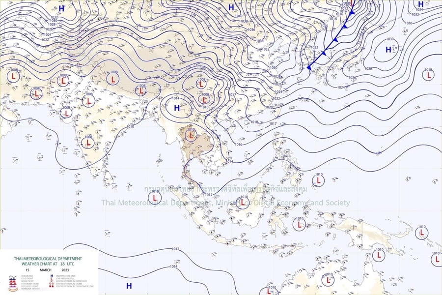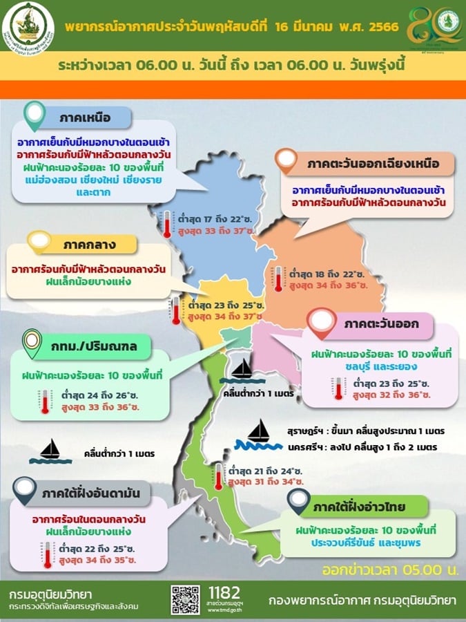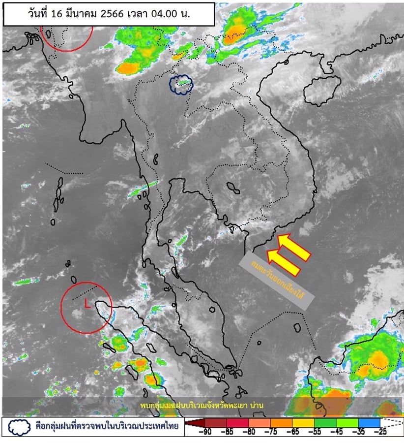 ลักษณะอากาศทั่วไป พยากรณ์อากาศ 24 ชั่วโมงข้างหน้า ลมตะวันออกและลมตะวันออกเฉียงใต้พัดปกคลุมประเทศไทยตอนบน ในขณะที่บริเวณดังกล่าวมีอากาศร้อนกับมีฟ้าหลัวในตอนกลางวัน ลักษณะเช่นนี้ทำให้บริเวณประเทศไทยตอนบนมีฝนฟ้าคะนองบางแห่ง ขอให้ประชาชนบริเวณประเทศไทยตอนบนดูแลรักษาสุขภาพเนื่องจากสภาพอากาศที่เปลี่ยนแปลงในระยะนี้