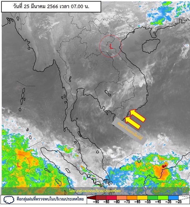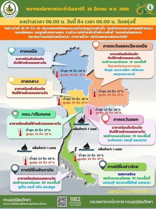 อนึ่ง ในช่วงวันที่ 26-29 มี.ค. 66 บริเวณความกดอากาศสูงกำลังปานกลางจากประเทศจีน จะแผ่ลงมาปกคลุมภาคตะวันออกเฉียงเหนือและทะเลจีนใต้ ส่งผลทำให้มีลมใต้และลมตะวันออกเฉียงใต้ พัดนำความชื้นจากอ่าวไทยและทะเลจีนใต้ เข้ามาปกคลุมประเทศไทยตอนบน ในขณะที่ประเทศไทยตอนบน มีอากาศร้อนถึงร้อนจัด ลักษณะเช่นนี้ทำให้บริเวณดังกล่าว มีพายุฤดูร้อนเกิดขึ้น โดยมีลักษณะของพายุฝนฟ้าคะนอง ลมกระโชกแรง และลูกเห็บตกบางแห่ง รวมถึงอาจมีฟ้าผ่าเกิดขึ้นได้บางพื้นที่ โดยจะเริ่มมีผลกระทบในภาคตะวันออกเฉียงเหนือก่อน ส่วนภาคอื่นๆ จะได้รับผลกระทบในระยะถัดไป