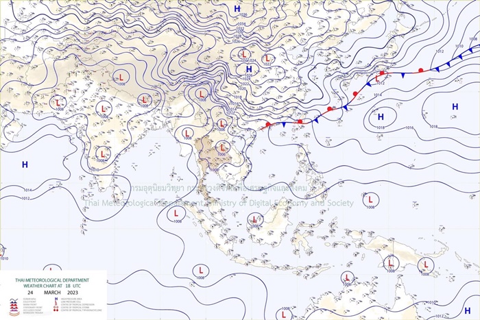 ลักษณะอากาศทั่วไป พยากรณ์อากาศ 24 ชั่วโมงข้างหน้า ความกดอากาศต่ำเนื่องจากความร้อนปกคลุมประเทศไทยตอนบน ลักษณะเช่นนี้ทำให้ประเทศไทยตอนบนมีอากาศร้อนโดยทั่วไป กับมีฟ้าหลัวในตอนกลางวัน และมีอากาศร้อนจัดบางพื้นที่ ในขณะที่ลมใต้ยังคงพัดปกคลุมภาคตะวันออกเฉียงเหนือตอนล่าง ภาคกลางตอนล่าง และภาคตะวันออก ทำให้ภาคตะวันออกเฉียงเหนือตอนล่าง และภาคตะวันออก มีฝนฟ้าคะนองกับมีลมกระโชกแรงบางแห่ง ขอให้ประชาชนในบริเวณดังกล่าว ดูแลรักษาสุขภาพเนื่องจากสภาพอากาศที่ร้อนถึงร้อนจัด รวมถึงระวังอันตรายจากฝนฟ้าคะนอง และลมกระโชกแรงที่เกิดขึ้นไว้ด้วย สำหรับลมตะวันออกเฉียงใต้และลมตะวันตกเฉียงเหนือ พัดปกคลุมอ่าวไทย ภาคใต้ และทะเลอันดามัน ทำให้ภาคใต้มีฝนฟ้าคะนองบางแห่ง