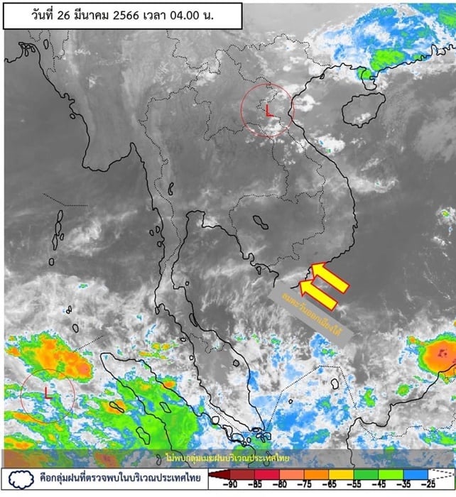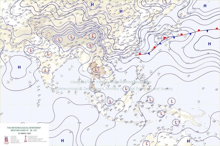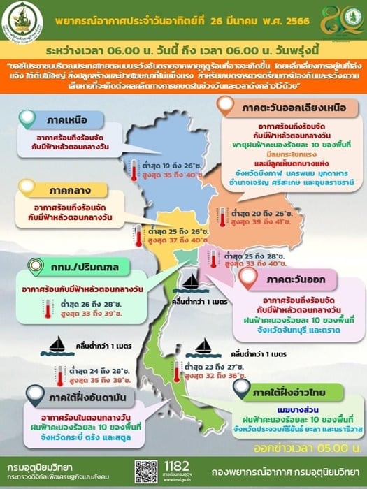 ลักษณะอากาศทั่วไป พยากรณ์อากาศ 24 ชั่วโมงข้างหน้า บริเวณความกดอากาศสูงหรือมวลอากาศเย็นกำลังปานกลางได้แผ่ลงมาปกคลุมถึงประเทศจีนตอนใต้ และประเทศเวียดนามตอนบนแล้ว คาดว่าจะแผ่ลงมาปกคลุมภาคตะวันออกเฉียงเหนือและทะเลจีนใต้ในวันพรุ่งนี้ (26 มี.ค. 66) ส่งผลทำให้มีลมใต้และลมตะวันออกเฉียงใต้พัดนำความชื้นจากอ่าวไทยและทะเลจีนใต้เข้ามาปกคลุมประเทศไทยตอนบน ในขณะที่ประเทศไทยมีอากาศร้อนถึงร้อนจัด ลักษณะเช่นนี้ทำให้บริเวณดังกล่าวจะมีพายุฤดูร้อนเกิดขึ้นในช่วงวันที่ 26 – 29 มีนาคม 2566 โดยมีลักษณะของพายุฝนฟ้าคะนอง ลมกระโชกแรง และมีลูกเห็บตกบางแห่ง รวมถึงอาจมีฟ้าผ่าเกิดขึ้นได้บางพื้นที่