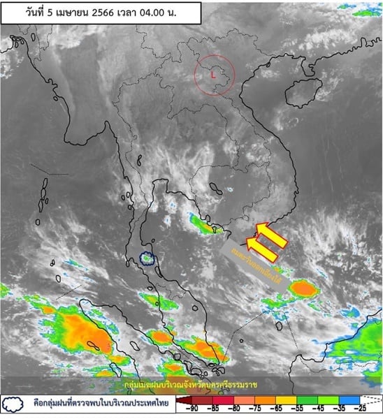 อนึ่ง ในช่วงวันที่ 6-9 เม.ย. 66 บริเวณความกดอากาศสูง หรือมวลอากาศเย็นกำลังปานกลางจากประเทศจีนจะแผ่ลงมาปกคลุมประเทศไทยตอนบนและทะเลจีนใต้ ส่งผลทำให้ลมใต้และลมตะวันออกเฉียงใต้ ที่พัดนำความชื้นจากอ่าวไทยและทะเลจีนใต้ เข้ามาปกคลุมประเทศไทยตอนบนมีกำลังแรงขึ้น ในขณะที่บริเวณประเทศไทยตอนบนมีอากาศร้อนถึงร้อนจัด ลักษณะเช่นนี้ทำให้บริเวณดังกล่าว จะมีพายุฤดูร้อนเกิดขึ้น โดยมีลักษณะของพายุฝนฟ้าคะนอง ลมกระโชกแรง และลูกเห็บตกบางแห่ง รวมถึงอาจมีฟ้าผ่าเกิดขึ้นได้บางพื้นที่ โดยจะเริ่มมีผลกระทบในภาคตะวันออกเฉียงเหนือตอนล่าง และภาคตะวันออกก่อน ส่วนภาคอื่นๆจะได้รับผลกระทบในระยะถัดไป