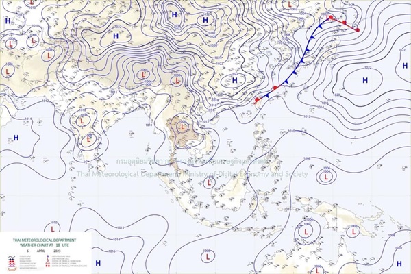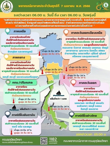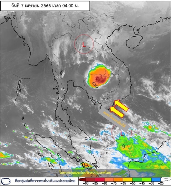 ลักษณะอากาศทั่วไป พยากรณ์อากาศ 24 ชั่วโมงข้างหน้า บริเวณความกดอากาศสูงหรือมวลอากาศเย็นกำลังปานกลาง แผ่ปกคลุมบริเวณประเทศลาว และประเทศเวียดนามตอนบนแล้ว คาดว่าจะแผ่ลงมาปกคลุมภาคตะวันออกเฉียงเหนือและทะเลจีนใต้ ในวันนี้ (7 เม.ย. 66) ส่งผลทำให้ลมใต้และลมตะวันออกเฉียงใต้ ที่พัดนำความชื้นจากอ่าวไทยและทะเลจีนใต้ เข้ามาปกคลุมประเทศไทยตอนบนมีกำลังแรงขึ้น ในขณะที่บริเวณประเทศไทยตอนบนมีอากาศร้อนถึงร้อนจัด ลักษณะเช่นนี้ทำให้บริเวณดังกล่าว จะมีพายุฤดูร้อนเกิดขึ้น โดยมีลักษณะของพายุฝนฟ้าคะนอง ลมกระโชกแรง และลูกเห็บตกบางแห่ง รวมถึงอาจมีฟ้าผ่าเกิดขึ้นได้บางพื้นที่ จึงขอให้ประชาชนในบริเวณดังกล่าว ระวังอันตรายจากพายุฤดูร้อนที่อาจจะเกิดขึ้น โดยหลีกเลี่ยงการอยู่ในที่โล่งแจ้ง ใต้ต้นไม้ใหญ่ สิ่งปลูกสร้างและป้ายโฆษณาที่ไม่แข็งแรง