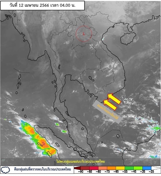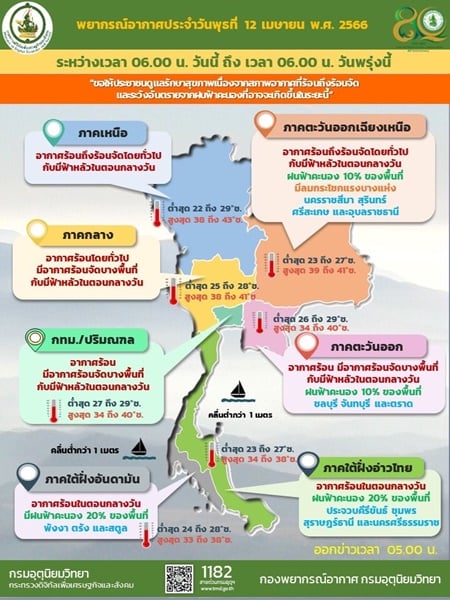ลักษณะอากาศทั่วไป พยากรณ์อากาศ 24 ชั่วโมงข้างหน้า ประเทศไทยมีอากาศร้อนโดยทั่วไปกับมีฟ้าหลัวในตอนกลางวัน และมีอากาศร้อนจัดบางพื้นที่ในภาคเหนือ ภาคตะวันออกเฉียงเหนือ ภาคกลาง รวมทั้งกรุงเทพมหานครและปริมณฑล และภาคตะวันออก ทั้งนี้เนื่องจากบริเวณความกดอากาศต่ำ เนื่องจากความร้อนปกคลุมประเทศไทยตอนบน ในขณะที่ลมใต้พัดปกคลุมภาคตะวันออกเฉียงเหนือตอนล่าง ภาคกลางตอนล่าง และภาคตะวันออก ทำให้ภาคตะวันออกเฉียงเหนือ และภาคตะวันออก มีฝนฟ้าคะนองบางแห่ง จึงขอให้ประชาชนดูแลรักษาสุขภาพ เนื่องจากสภาพอากาศที่ร้อนถึงร้อนจัด และระวังอันตรายจากฝนฟ้าคะนองที่อาจจะเกิดขึ้นในระยะนี้ไว้ด้วย